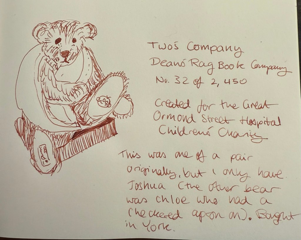 Here’s Joshua from the Two’s Company Dean Rag Book company. He’s a British bear, and I bought him second hand in York from a store called Mary Shortle’s.