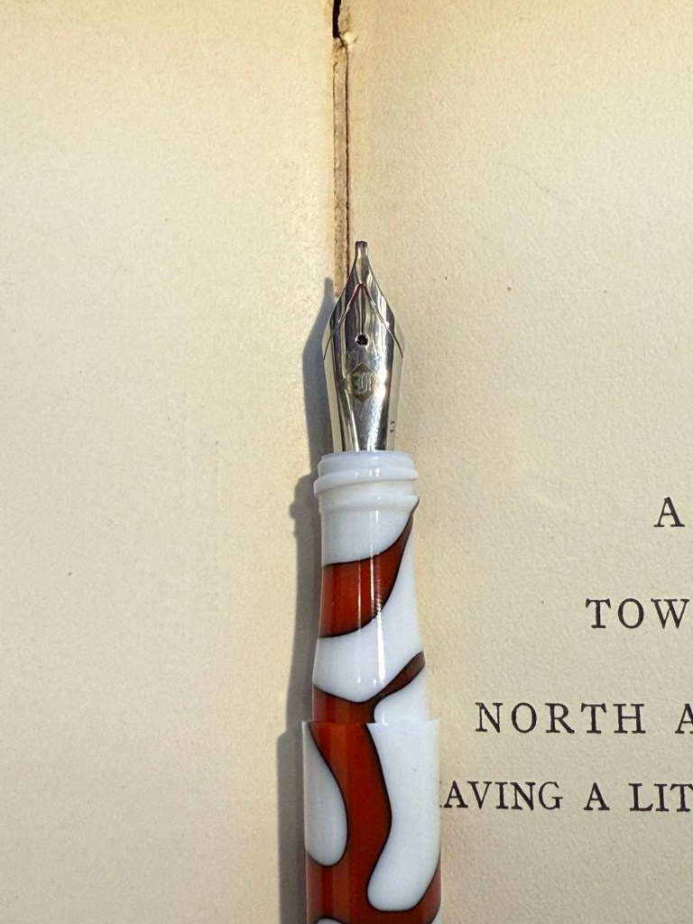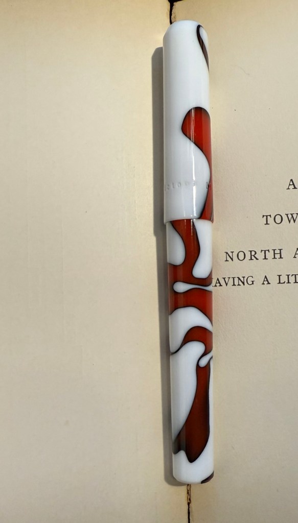 - Franklin Christoph 03 modified prototype- Red/White/Black motion with a 1.1 HPSteel cursive calligraphy nib. This is a new pen that I bought last year as my chemo anniversary pen (I buy myself a present every year to mark the occasion). I love the unusual resin colour and pattern, and I like FC’s HPSteel 1.1 nibs. They are just wide enough to really show off the ink without becoming a nightmare to use because it takes ages for the ink to dry.