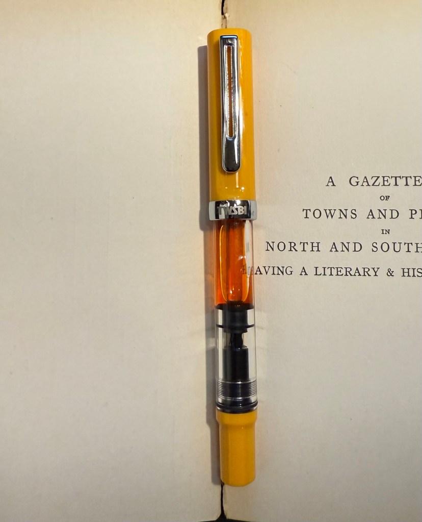 - TWSBI ECO Saffron fine nib filled with Rohrer & Klingner Helianthus ink. I use yellow inks even less often that I use red inks, but this ink is fairly readable for a yellow ink. It is, however, not going anywhere near a vintage pen as it has a tendency to crust over (as many yellow inks do). I wanted something bright, cheerful and different, and this ink checked all three. The TWSBI ECO is a phenomenal pen for those starting out with bottled fountain pen ink, and I can’t recommend it enough.