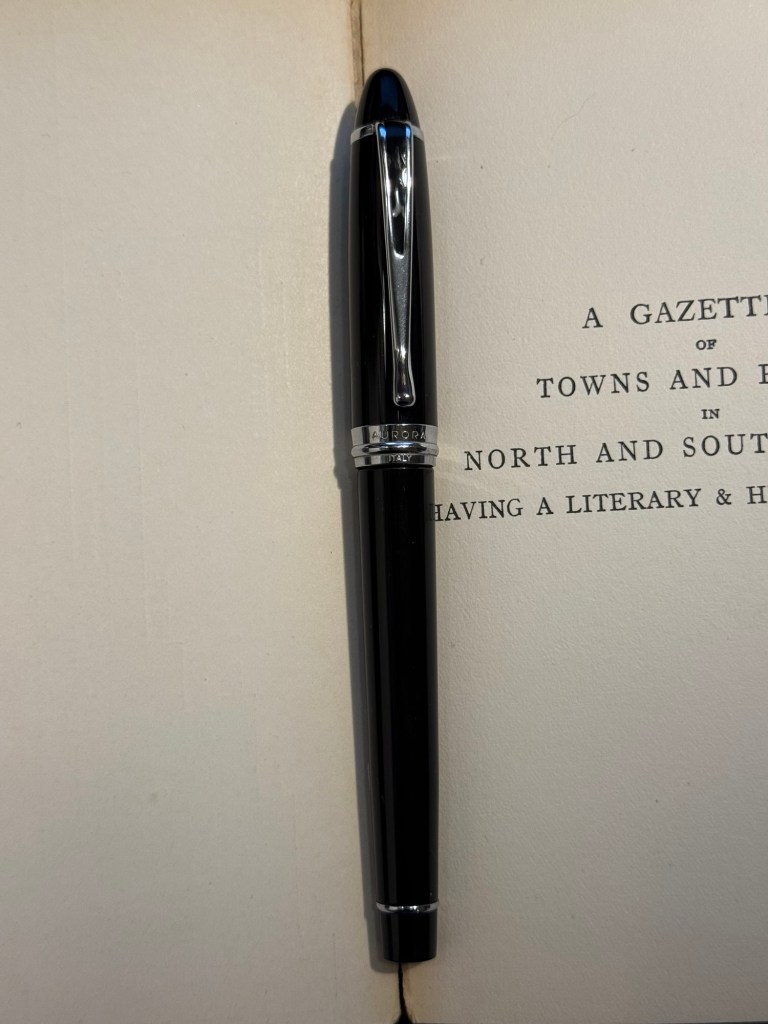 - Aurora Ipsilon medium nib with Rohrer & Klingner Alt-Goldrün ink. This is my one and only Aurora pen, which I bought years ago in Florence, Italy. Aurora nibs are nice enough, but the pens are priced well above what I believe that they are worth, so I have steered clear of them over the years. The Ipsilon is small pen, but you can’t post it, which is annoying for such a small pen. R&K Alt-Goldrün is a fantastic ink colour – a non standard green with plenty of shading and character – and the only reason I haven’t used it more is because it was tucked away behind two rows of other ink bottles. If you are just starting out with green inks, give Alt-Goldrün a try.