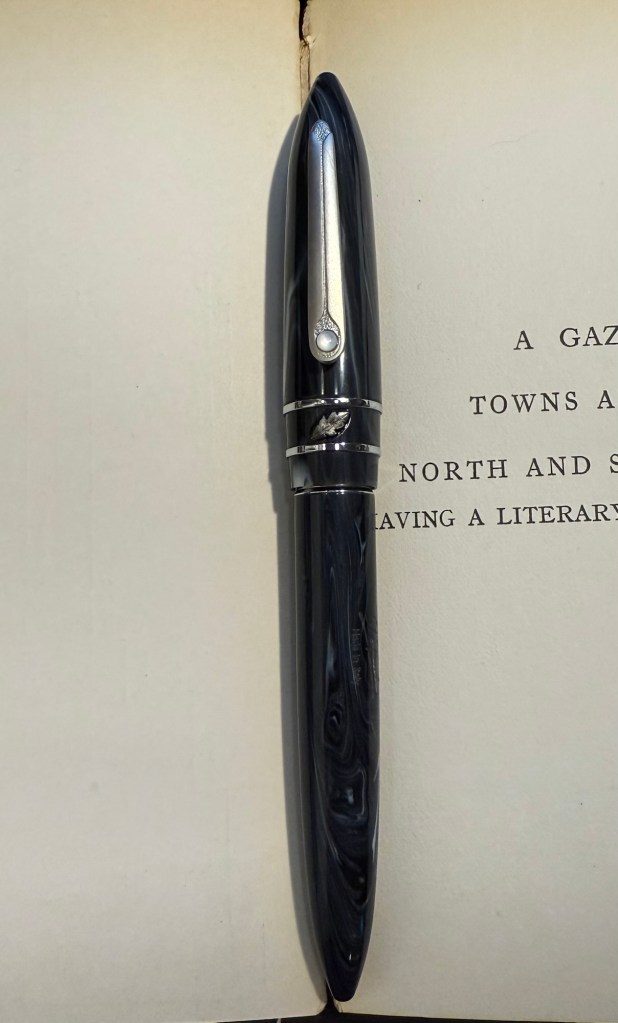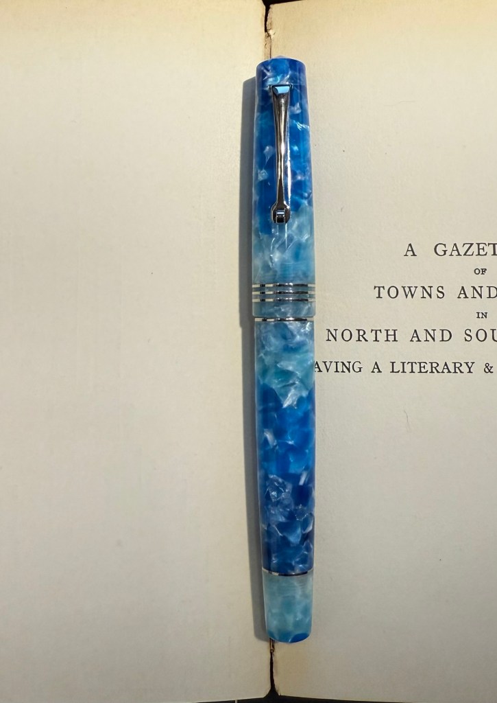 - Finally, speaking of a pen and ink combo that have gotten “lost” in my collection: the Stipula Model T marbled grey pen was also an Italian purchase, and it has a very peculiar fine “flexy” titanium nib. I would characterize the nib as springy, and as my other titanium nib Stipula does, it squeaks sometimes as you write with it. The ink is one that I bought in 2013 in Fahrney’s pen store in Washington DC. Since then I haven’t opened it and used it, mainly because Fahrney’s Tempest Blue is a blue ink, and I don’t use blue inks often. It shades nicely, but other than that it looks close enough to my benchmark blue, Waterman Florida Blue (now renamed to Waterman Serenity Blue), for me not to bother using it often. Waterman Serenity Blue is a best-in-class blue in my opinion because it’s so well behaved, gentle and easy to clean out of pens that you can safely use it in any pen that you have, particularly vintage ones.