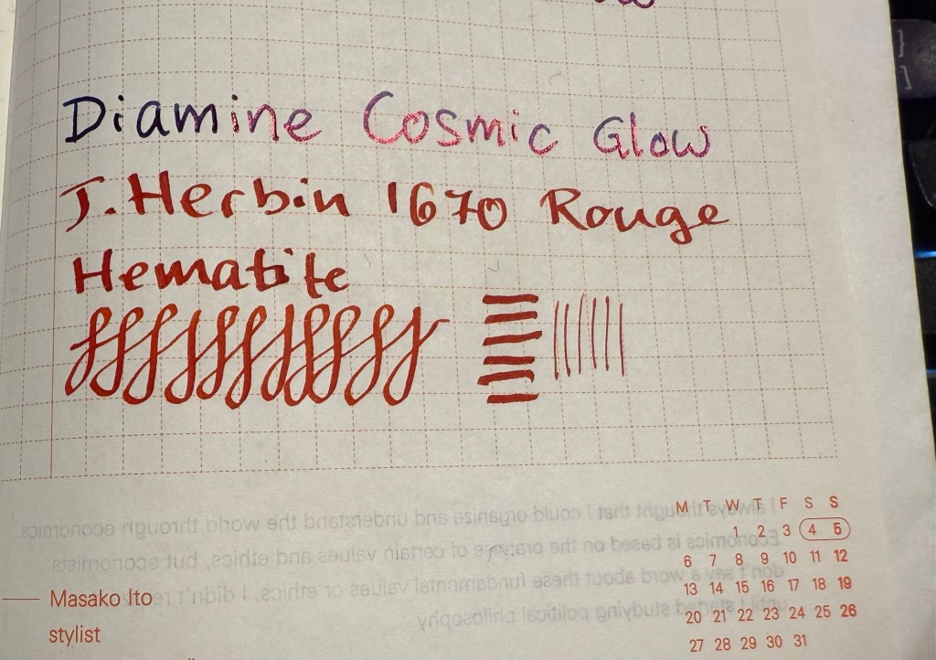 As nice as the pen is (and it is), the ink is the star in this one in terms of interest: it’s the ORIGINAL J.Herbin 1670 Rouge Hematite, which means that it has NO GLITTER and NO SHEEN. It’s just a deep, bright red with some nice shading and good outlining, but it isn’t full of gold glitter and sheen to the point where you can’t see the base colour. Yes, this is also the bottle that had the problematic crumbly wax cover on the cap, but I really think that I prefer this version to the one they issued later (I have both). I don’t normally use red inks, but this one was perfect for this pen.