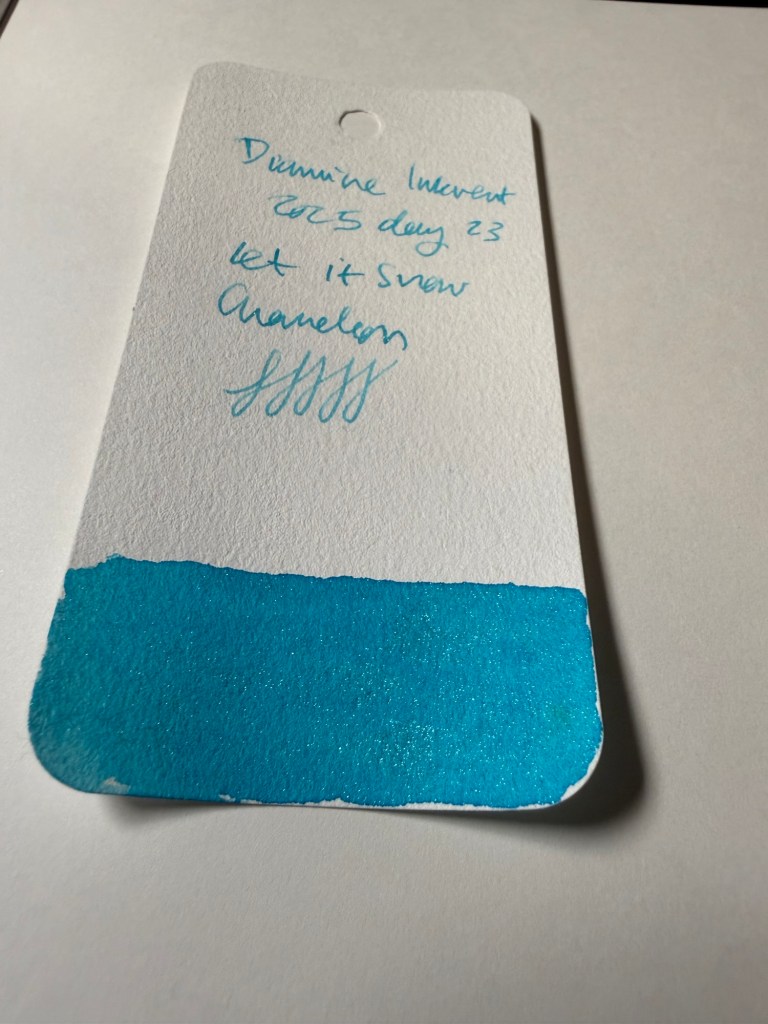 Day 23’s ink is Diamine Let it Snow, a turquoise ink with chameleon shimmer. It’s a lovely ink (turquoise is my favourite, and it’s utterly appropriate for this year’s inkvent) with some nice shading as a bonus.