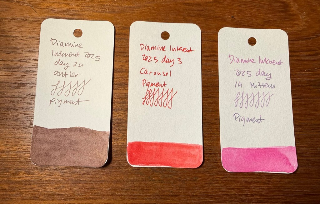 Four reds and pinks were in this year’s Inkvent, which is a pretty low number for an average Inkvent calendar. These were all decent Inkvent inks, and I’m pretty pleased with this lineup.