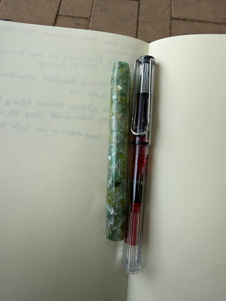 Lamy Vista medium nib with Pilot Iroshizuku Kosumosu ink. I wanted a pink ink in rotation and this is a new pen that I wanted to use. Kosumosu is a lighter pink so it benefits from wider nibs.