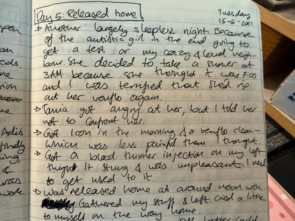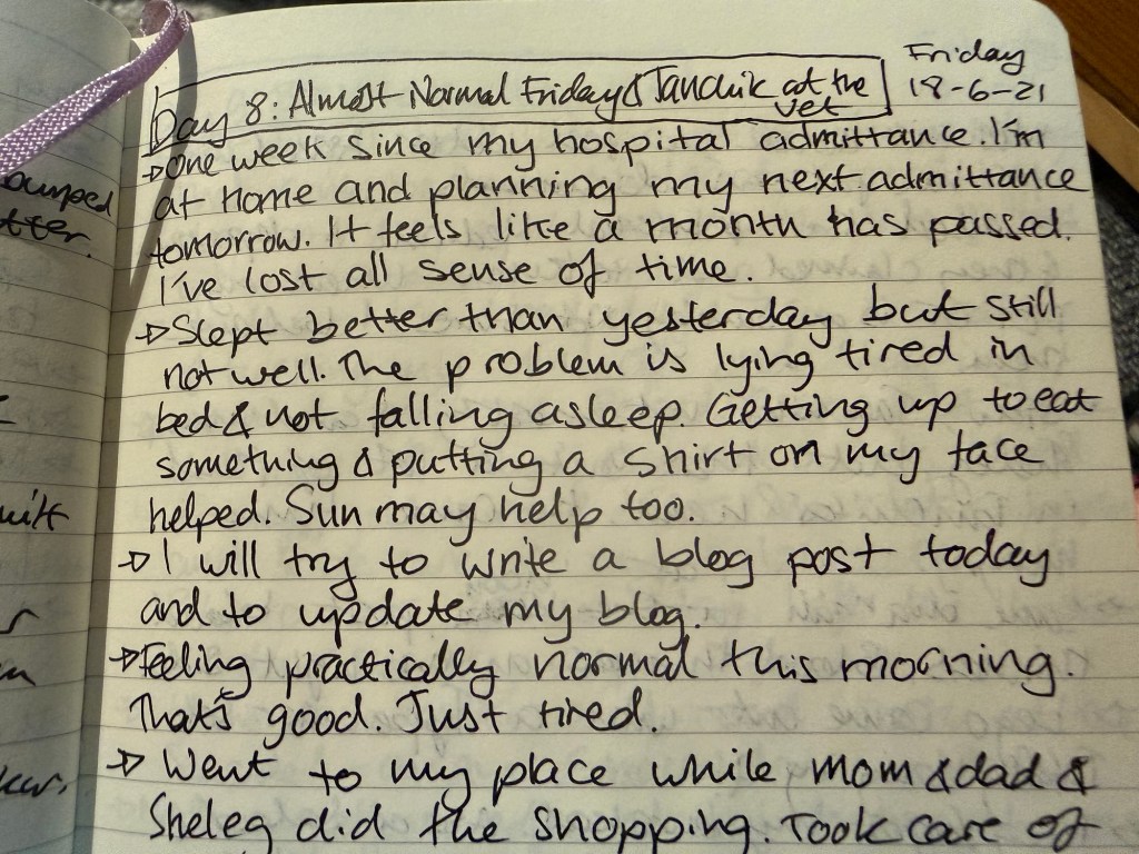 I don’t normally publish excerpts from my journals, as they are private, but in this case I thought it might be useful to see a few snippets of what journaling under stress looks like.