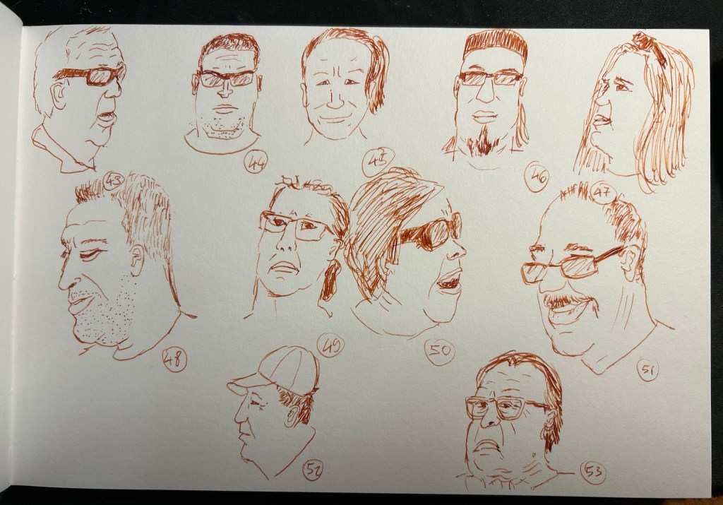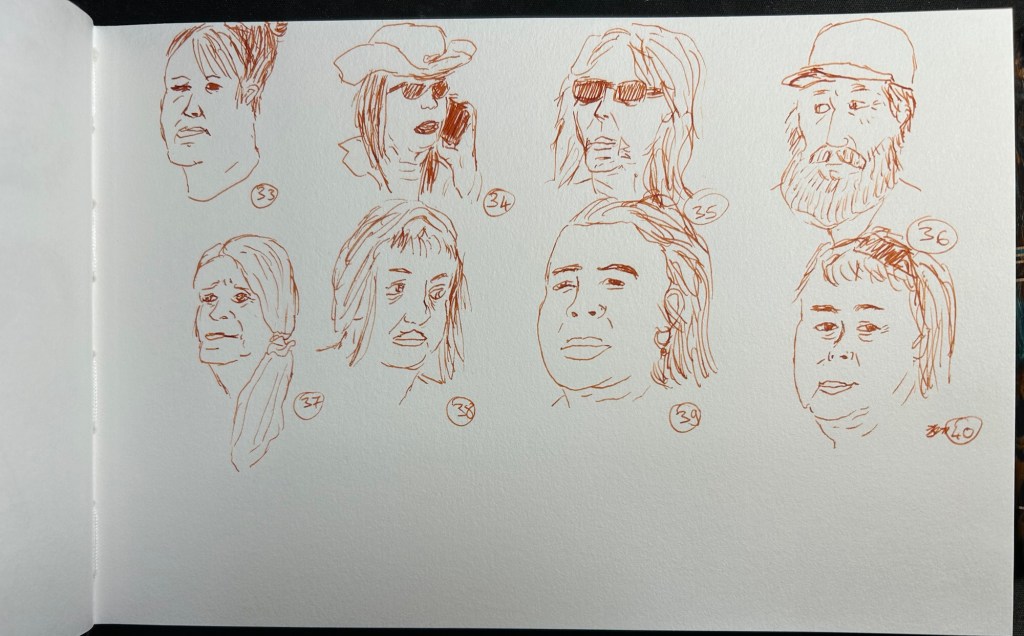 I really didn’t feel like sketching today, as I discovered that my cat has a large lump on his hind leg so I need to take him to the vet tomorrow. I’m worried about him and so considered skipping today entirely, but ended up sketching some people to distract myself. Same setup as yesterday – Leonardo Momento Zero fountain pen, Diamine Fireside Snug ink, Stillman and Birn Alpha.