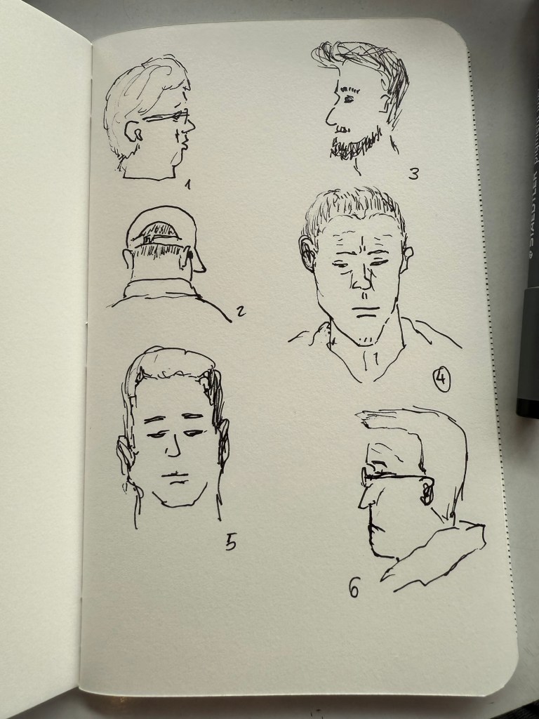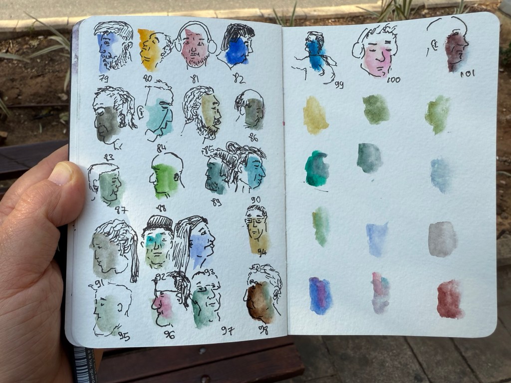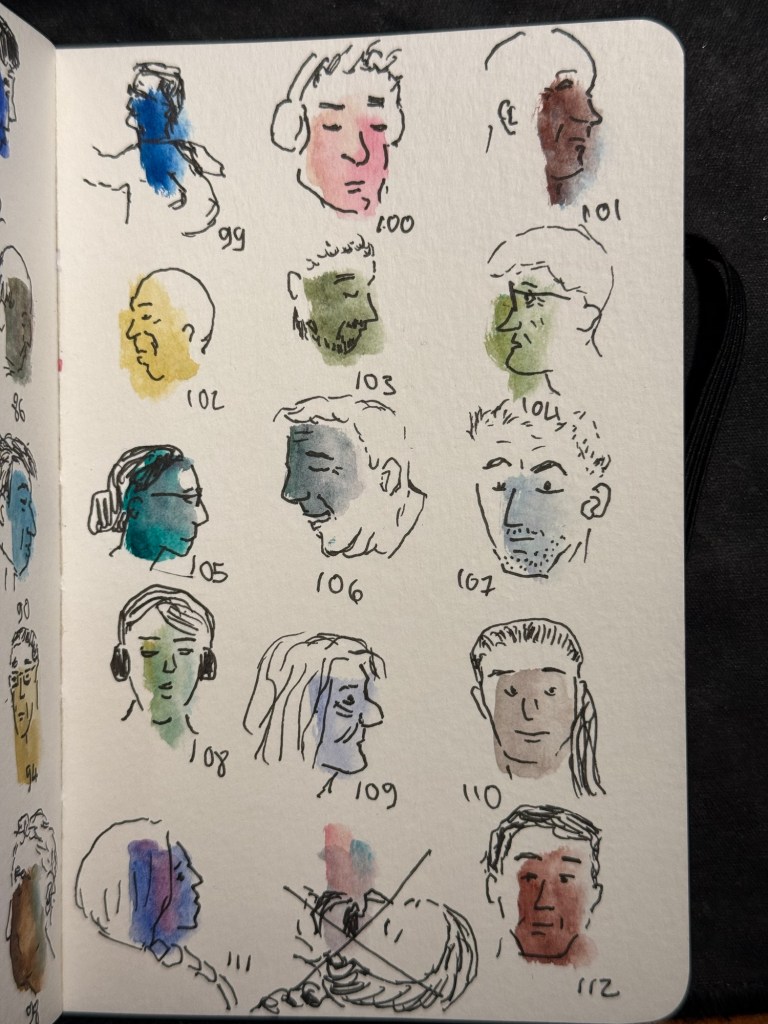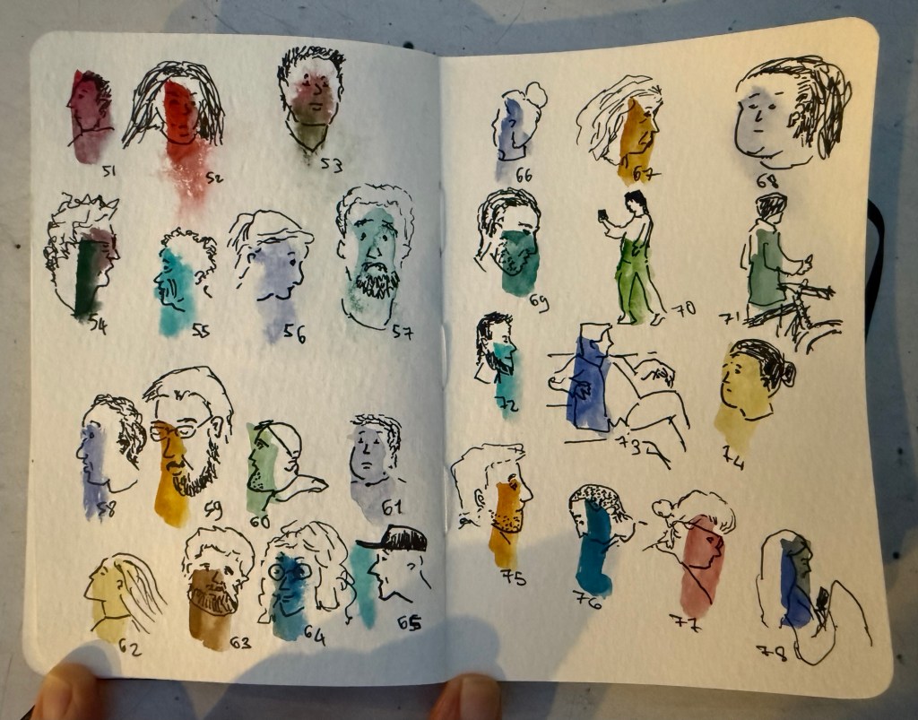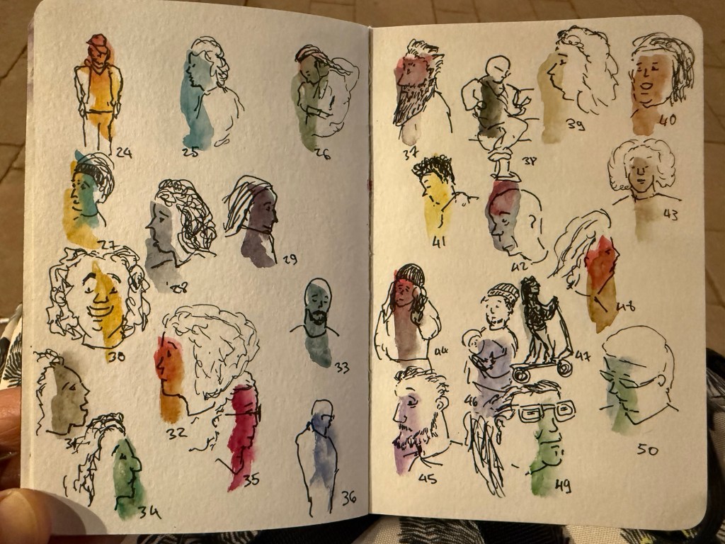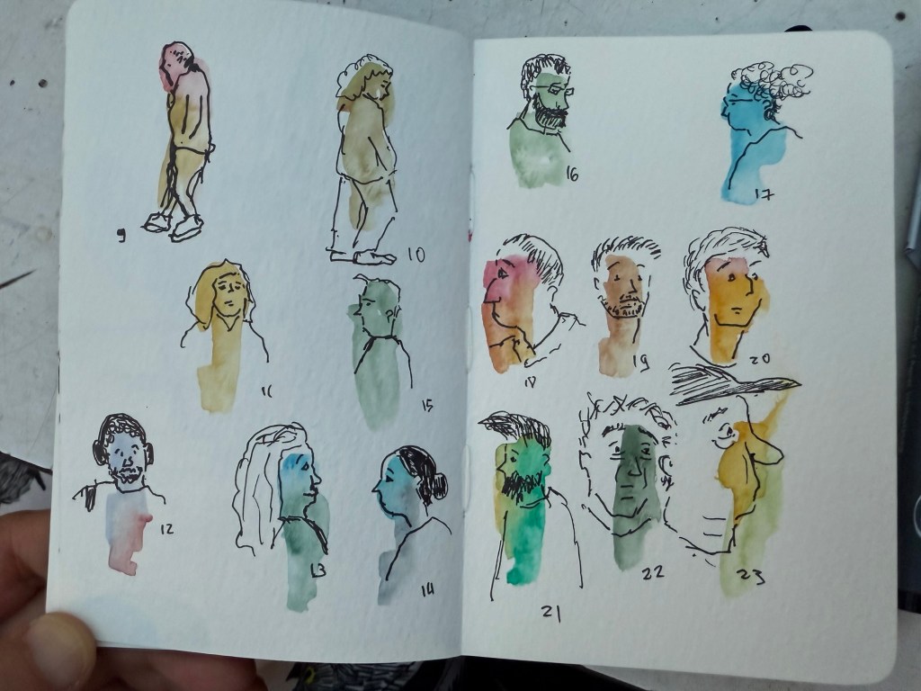 I finished the One Week 100 People challenge on day 4, but kept going for day 5 (which was yesterday) and added a few sketches on day 6 (even though the official challenge is 5 days long). It was the first time that I sketched only live subjects and not from photos, and it really pushed me to find ways to work fast.