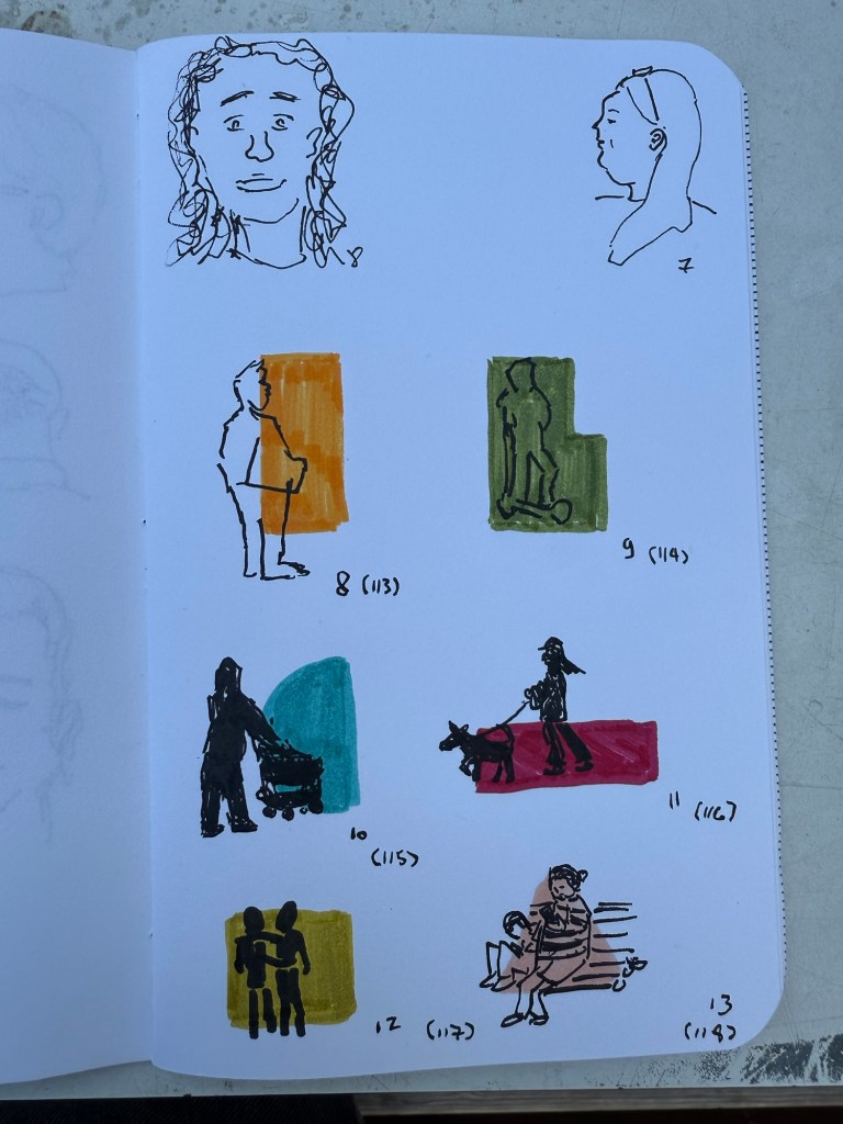 Today I added a few final sketches to my Field Notes sketchbook, this time using Faber Castell Pitt brush pens for blocks of colour and a Pilot brush pen for the sketches themselves. I was trying to work mainly with silhouettes and capture people in movement. It took me longer than I thought to capture a mere 6 subjects, mostly because what people do when they walk around nowadays is stare at their phones.