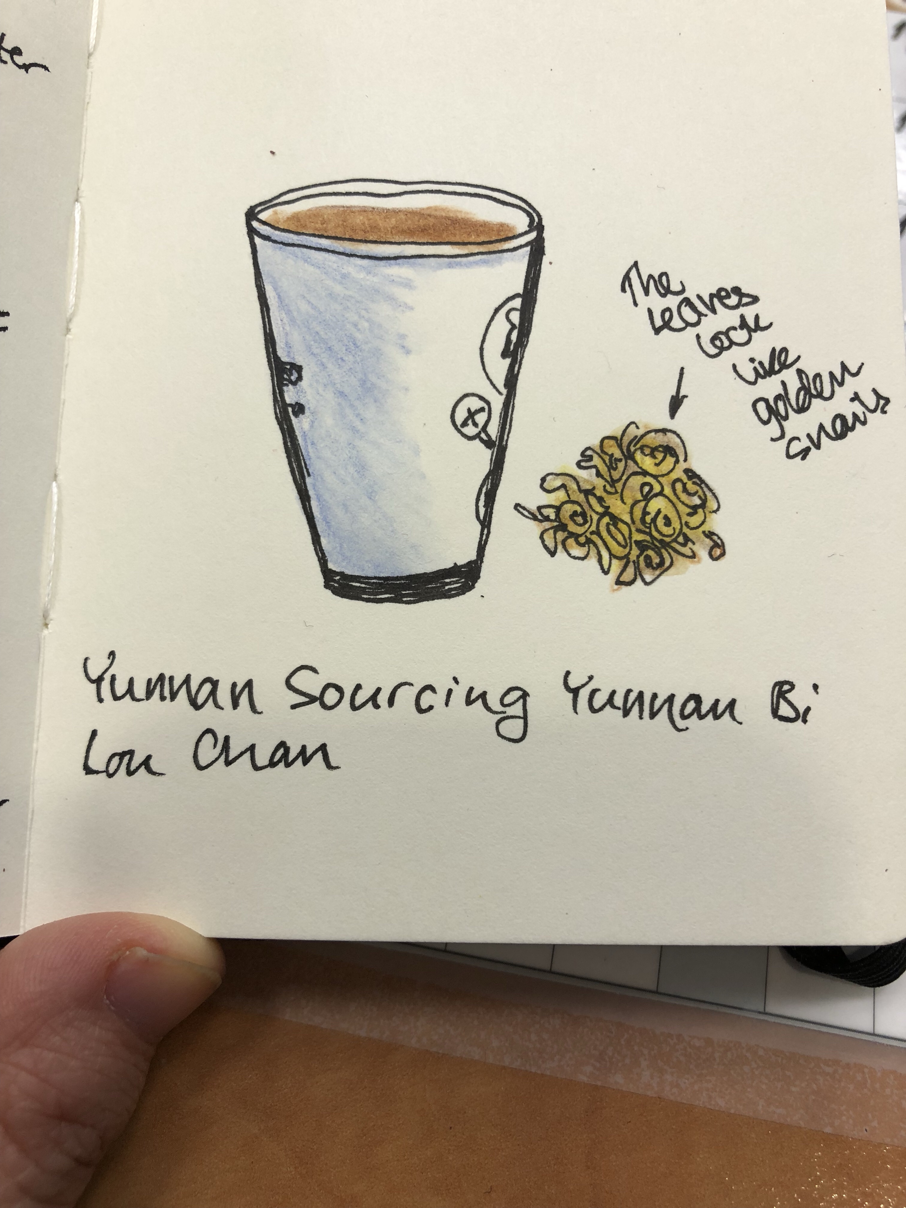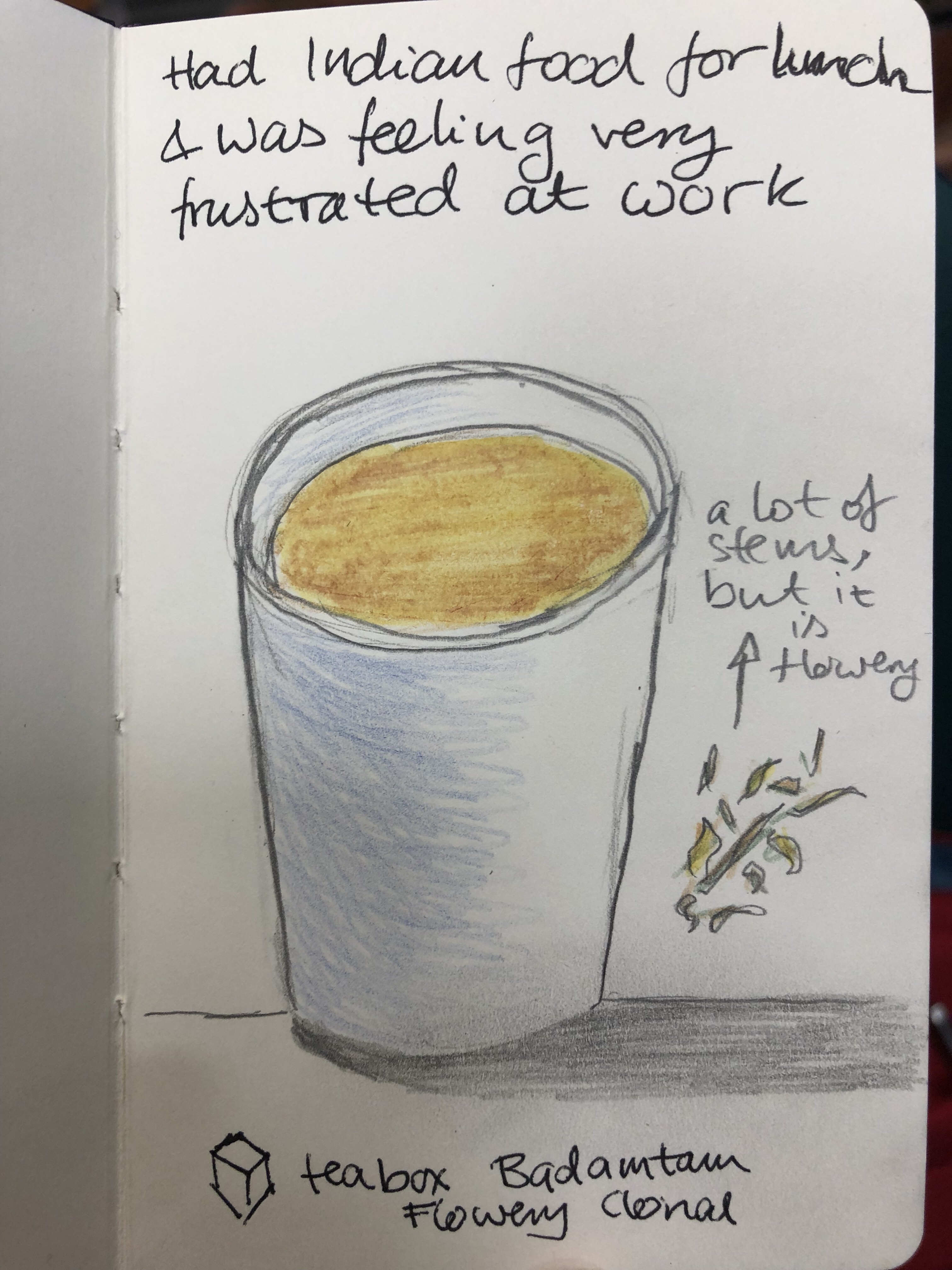 I drew this spread as part of Liz Steel‘s Sketching Now Sketchbook Design course, and it records my experiences from the final virtual tea seminar session that I had with Juyan from The Chinese Tea Company. I took all of the seminars that she offers, and I can see that she’s running a few of them again later this month and next month. I highly, highly recommend them (I’m not affiliated or paid to say this in any way, I’m just a happy longtime customer of her wonderful shop). Whether you are just starting out in Chinese tea or you’re well versed in Gong fu tea brewing, you’ll learn a lot about tea and tea tasting in her seminars, and have a lot of fun along the way. You get four tea samples that you drink while your in the seminar (and there’s enough left over for another brewing post seminar too), Juyan gives a presentation about the tea, the grower and the growing region, as well as tips on how to assess the leaves, brew them and taste them. The seminars are small and intimate, and are a wonderful way to spend an evening. If you’re starting out the Fundamentals of Oolongs and Green Tea Exploration (currently sold out) are phenomenal, the Wu Yi Rock tea seminar is a must – a gateway into understanding a complicated and elusive tea (as is the Phoenix Oolong seminar, if she gives it again). The Puer tea masterclass (also sold out) is just that, and a great way to get familiar with an easily misunderstood class of teas, and the Silver Needle White Tea seminar will take you by surprise. Until this seminar I thought that white tea in general and Silver Needle in particular is boring, but it’s anything but that.
