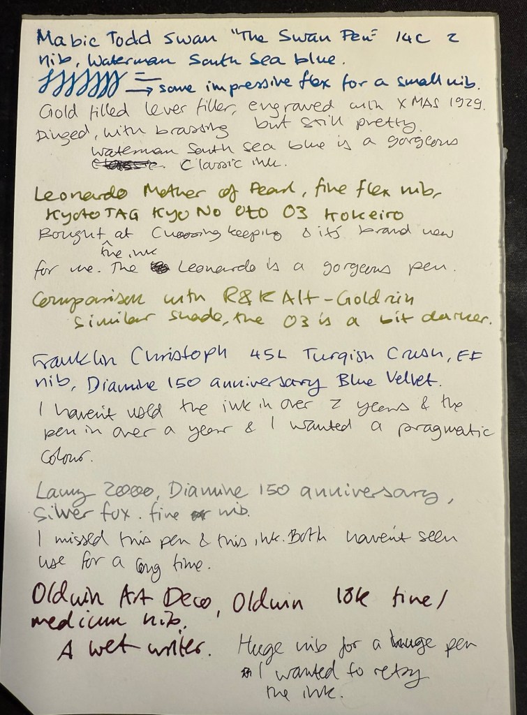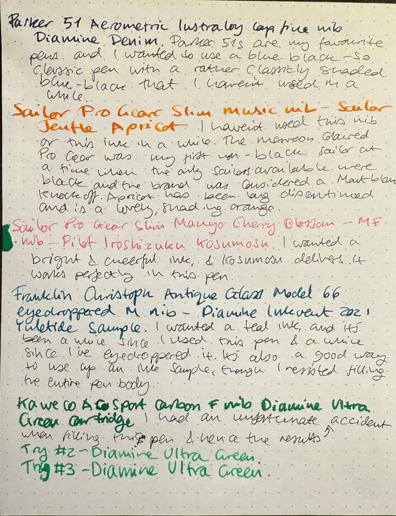 17.I am thinking about the next inks to put into rotation, which is a bit unusual for me as I normally start with the pens that I want to fill, and then go find inks that go well with them. I want a blue-black for practical reasons, a cheerful green, a pink or orange, and a turquoise or teal. How do you select which pens and inks you use?