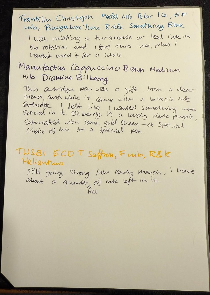 A new month means a new set of inked pens. From my previous rotation I still have the Lamy 2000 inked with Diamine Silver Fox, the TWSBI ECO Saffron inked with R&K Helianthus (and just about to run dry) and the Manufactus Cappuccino Brown filled with a Diamine Bilberry cartridge, also just about to run dry.