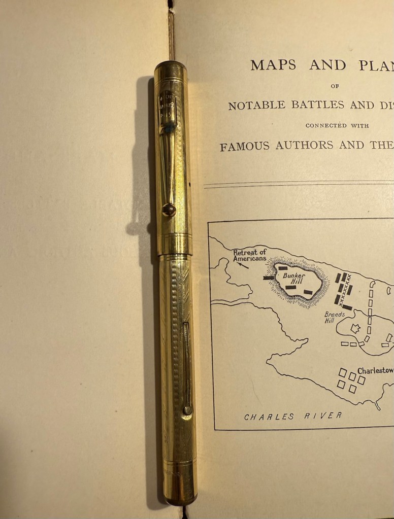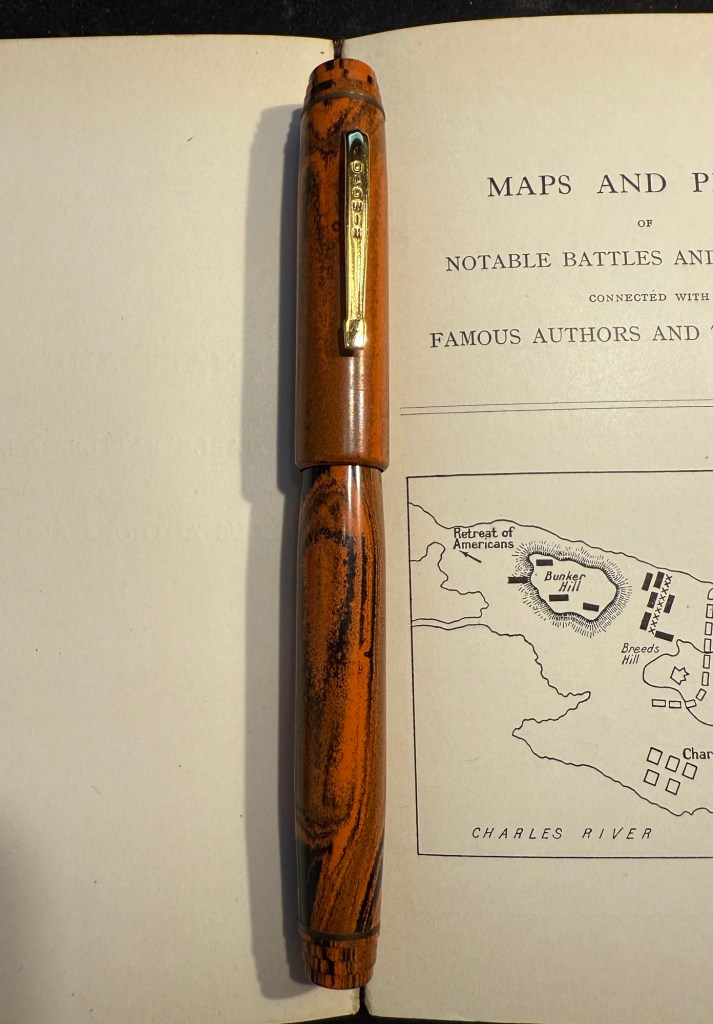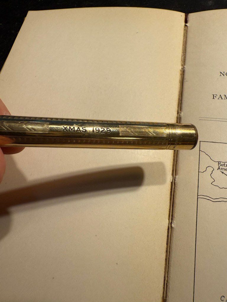 Normally engravings lower the value of a vintage fountain pen, but this one added value for me – I find it endlessly intriguing. This was clearly a Christmas gift, in 1929, and it was likely a lady’s pen, given its size and general level of decoration. I can stare at this pen and spin dozens of stories from that engraving, and this is one of the main reasons I prefer vintage pens. This one is “use grade” – the engraving, the dings on the body, the brassing on the clip, and the multitude of microscratches on it make it so – but I don’t care. It’s a treasure of a pen with a fantastic nib that I got at a very good price and gives me much joy. What else does one need?