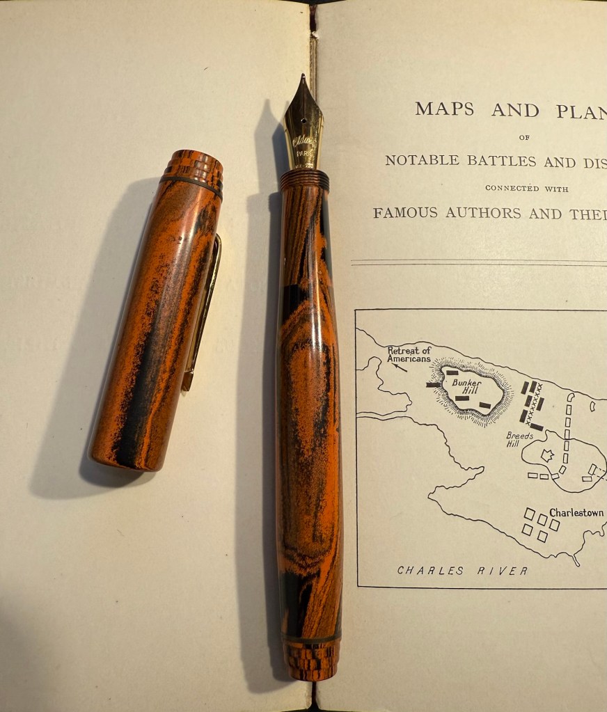 Oldwin Art Deco red and black striped ebonite, 18k medium nib with Diamine Writer’s Blood – as I’m writing this I have written this pen dry, mostly because it has a very wet and hungry nib and a standard sized converter. I bought this Oldwin from Mr Mora at Mora Stylos in Paris, and it’s a huge and surprisingly light pen.