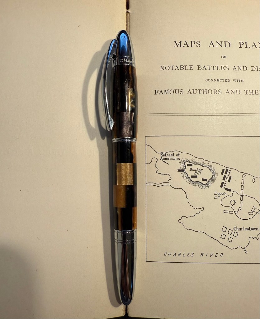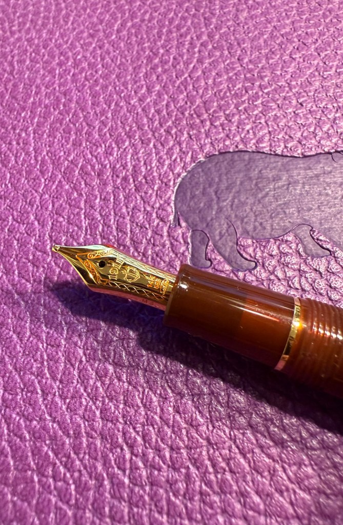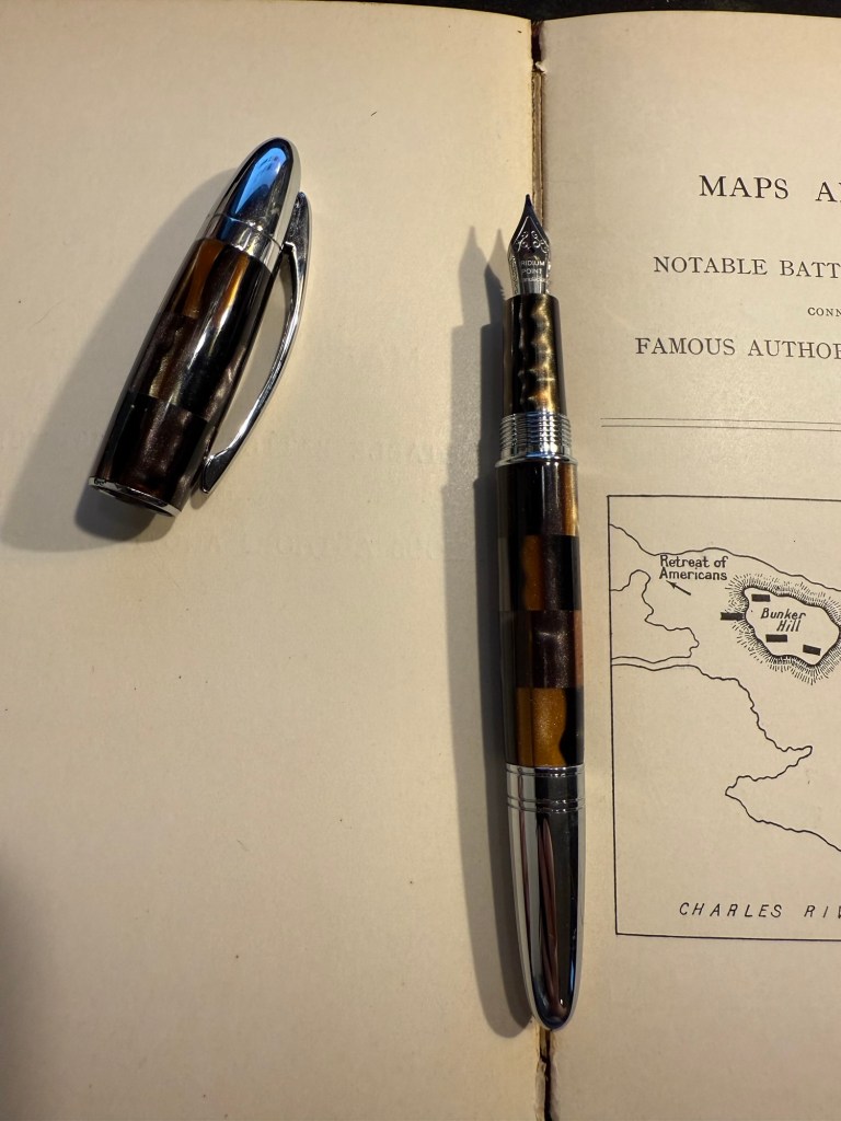 Manufactus Cappuccino Brown medium nib with Diamine Bilberry cartridge – this was a gift that I received from a dear friend who was just back from Italy and bought this (and a wonderful leather bound personalized journal) in the Manufactus store in Rome. The photo doesn’t do justice to the richness of the resin on this pen.
