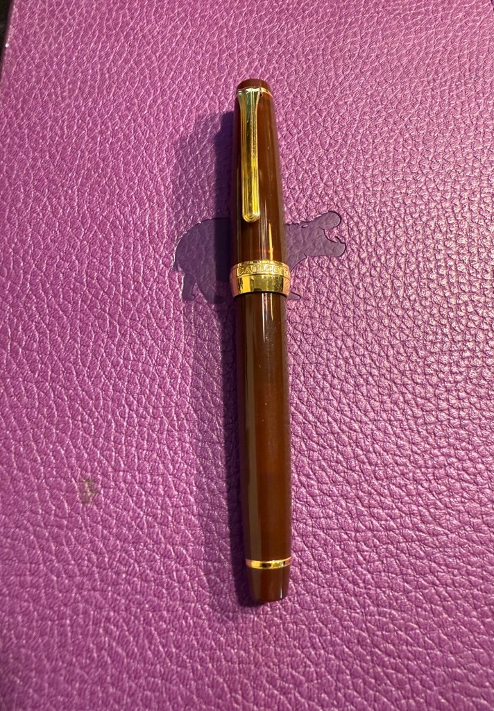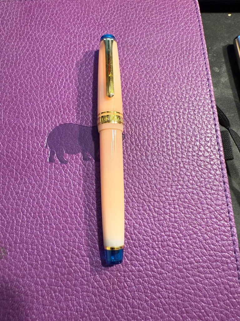 Sailor 1911 Pro Gear Slim Maroon music nib filled with Sailor Jentle Apricot – kids these days will turn up their nose on this pen body colour, but at the time it was the only Sailor that you could get that wasn’t black. I was into fountain pen nibs and didn’t really care what the pen body looked like, so long as I got to try the fabled Sailor music nib – a rare music nib that had only one slit and two tines instead of the usual two slits and three tines that other brand’s music nibs had. It still is a gorgeous nib that works very well with the long discontinued Sailor Jentle Apricot. You really see the shading with this pen and ink combination.