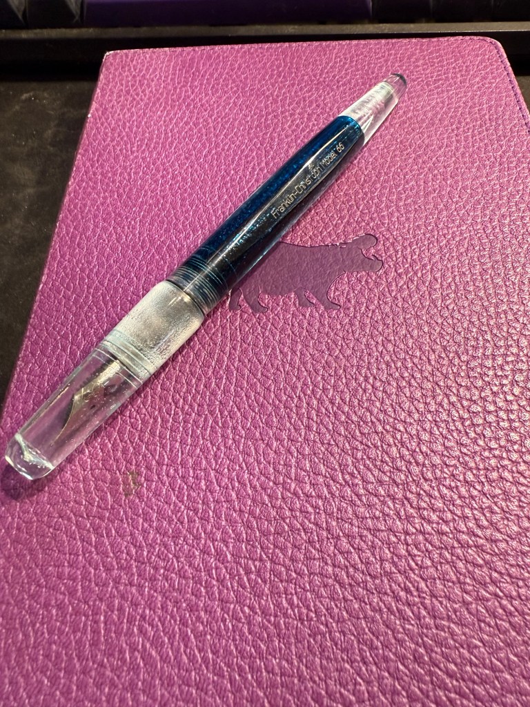 Franklin-Christoph Model 66 Antique Glass medium nib filled with Diamine Yuletide – this pen is now unavailable through Franklin-Christoph and only through second-hand resellers. It was one of my first Franklin-Christoph pens and one that I couldn’t wait to eyedropper (it’s built for that). The pen has a body that isn’t completely clear – beyond the slight fogging in the material (which is to be expected) the antique glass finish means that it has a blue-green tint, like a vintage coke bottle. It works exceptionally well with teal and turquoise inks, which is why I have only ever filled it up with teal and turquoise inks. In this case the ink of choice was Diamine Yuletide from the 2021 Diamine Inkvent calendar. I like this ink, but I’m still on the fence about buying a full bottle of it as I have a few other inks in a similar tone, some of them even Diamine inks. If you’re wondering how I eyedroppered this pen, it came with an o-ring and I have a tiny vial of silicone grease which I applied generously to the threads when filling it. So far no leaks, though as always with an eyedroppered pen, be careful with how you store it.