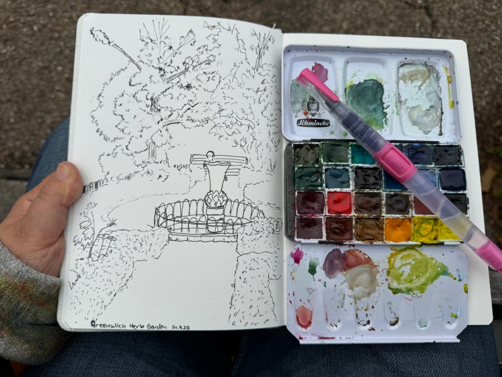 I created my first sketch in an Etchr lab cold pressed watercolour notebook while in the Greenwich Park herb garden and the paper is astonishingly good. Here’s the ink sketch (my tree sketches have gotten so much better thanks to a workshop I took in Poznan):