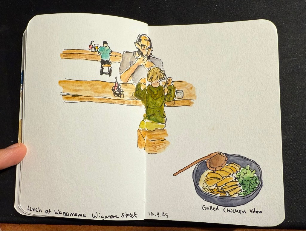 We then took the Eurostar to London. This is where I switched sketchbooks – this sketch of a boy and his father having lunch at a table across from me at Wagamama is the last sketch I created in my Stillman and Birn pocket beta. The beta has decent watercolour paper but it’s not half as good as the paper in my Etchr labs watercolour sketchbook, and the glued in pages make it a struggle to create full page spread sketches, as you can see here: