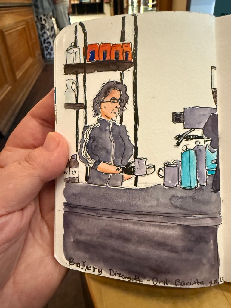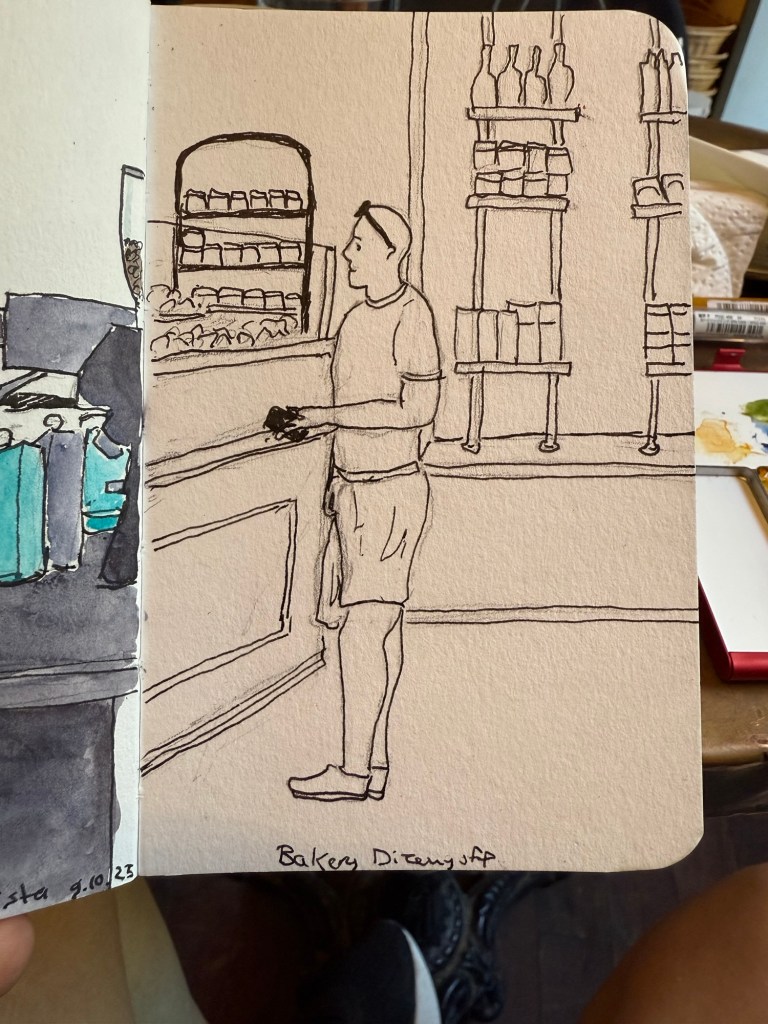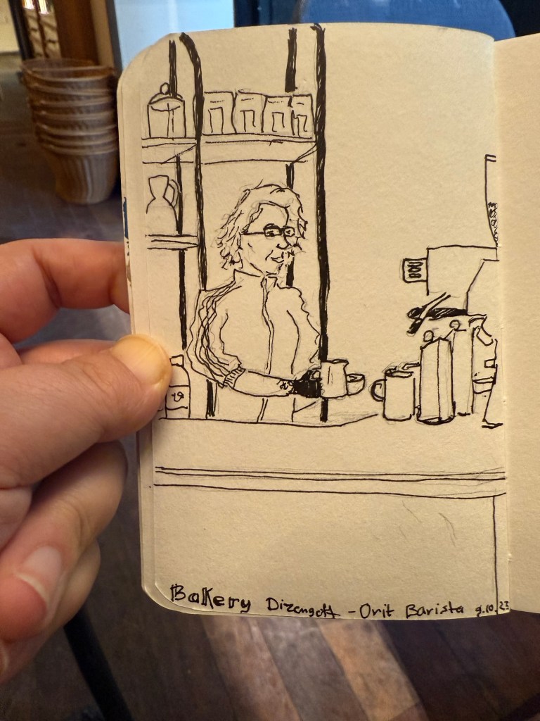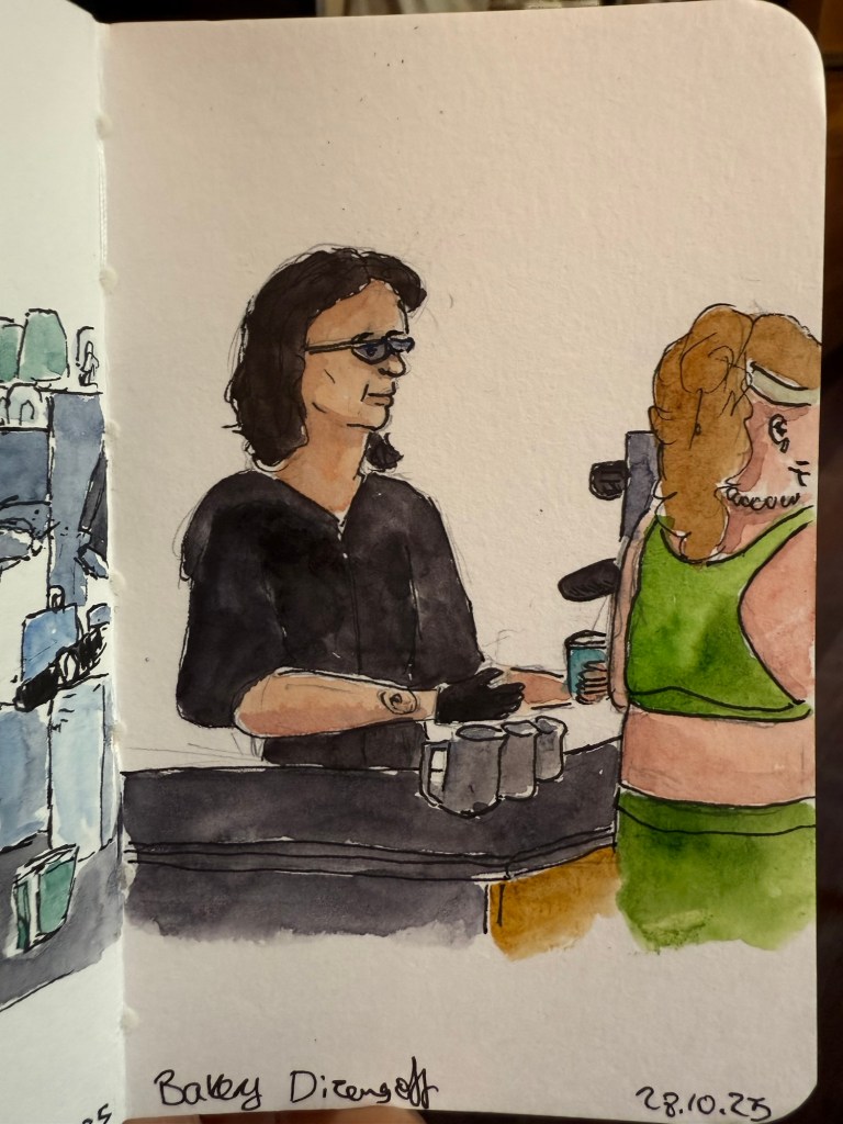 I went to see a local production of Singer, a play by Peter Flannery. It was phenomenal but it kept me up at night, which meant that the following morning I headed straight to my local cafe. I sketched the barista but something didn’t work in terms of getting her face right – she turned out sadder than she is. Sketching tired is rough.