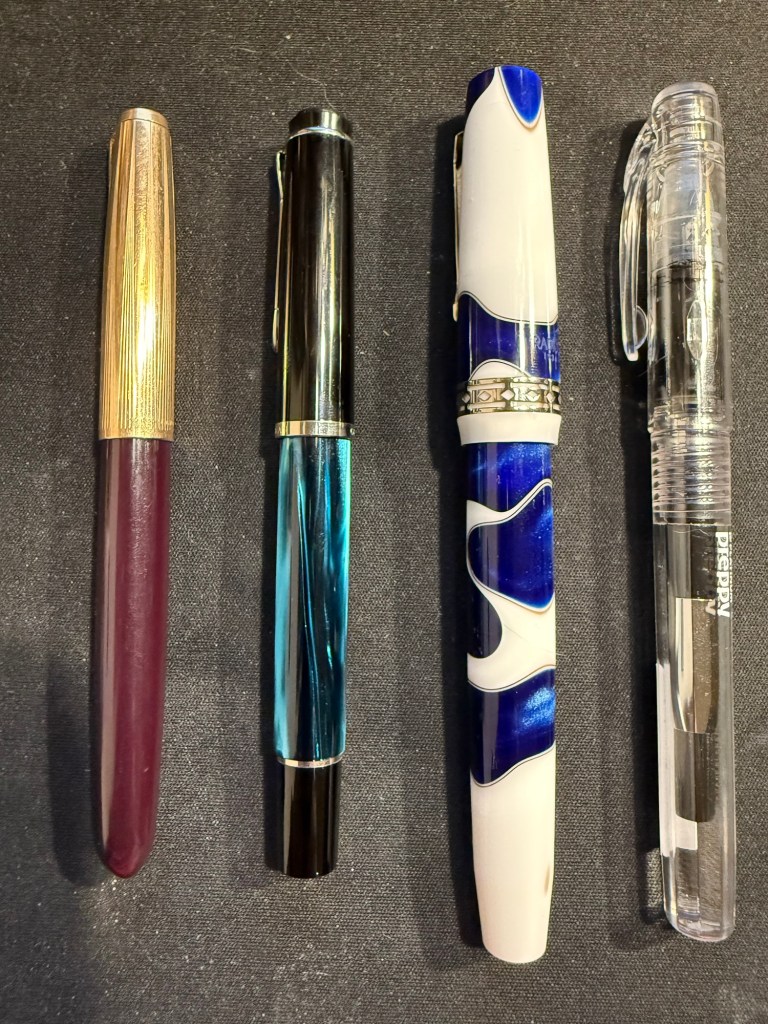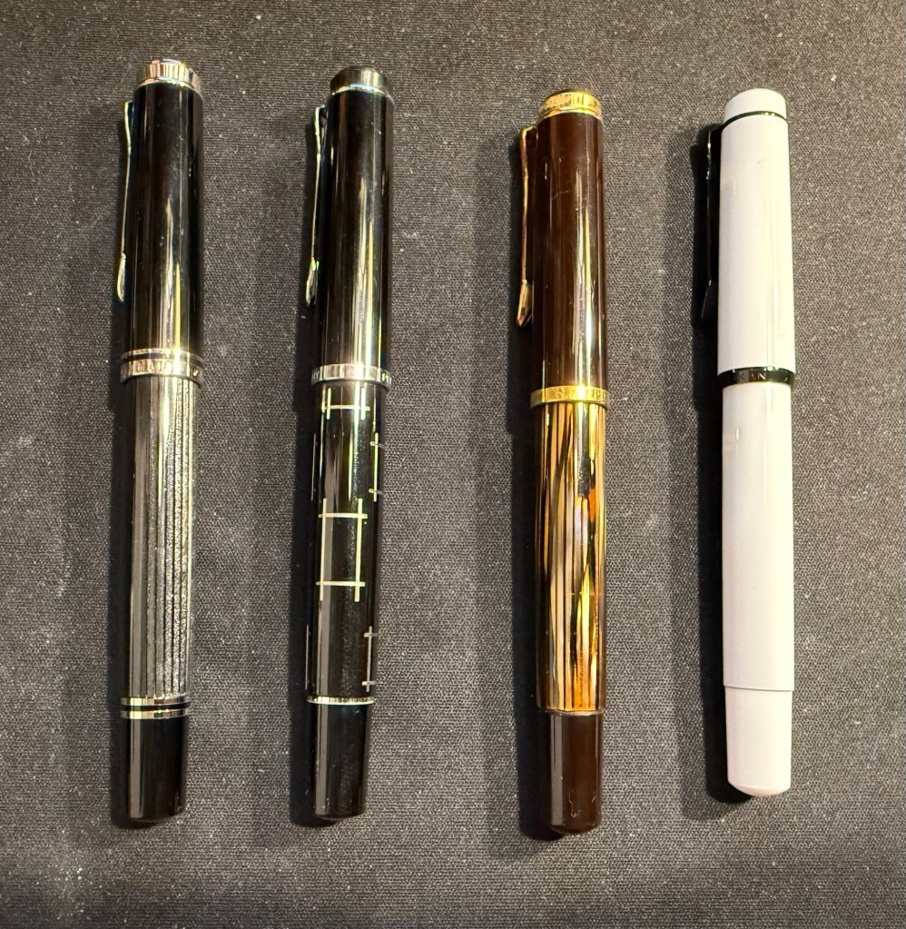 Pelikan Flock – left to right – Stresemann, M215 Rectangle (uninked), vintage M400 Tortoise (uninked), Stormtrooper (uninked)Left to right: Parker 61 Plum, M205 Petrol Marbled, Radius 1934 Settimo Cielo, Platinum Preppy