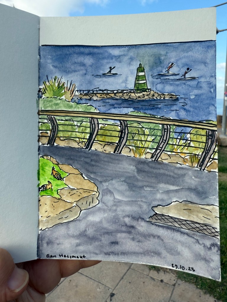 This morning I went on a walk before my usual swim. This sketch was made using a combination of Aquarius watercolours, Caran d’Ache neocolor II crayons, a Tombow brush pen and a 0.5 fineliner, all on a Pith Kabosu sketchbook.
