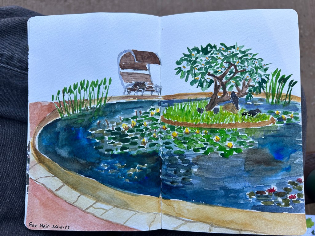 I went to a very special Urban Sketchers sketchwalk and drink and draw today. The event celebrated the end of a special sketch swap between a group of sketchers in Barcelona and in Tel Aviv, and there were sketchers there from all over the world (Spain, the Netherlands, Canada, India, etc). We met at Gan Meir in central Tel Aviv for a sketchwalk followed by a drink and draw at the top of Libling house. It was hot, it was humid, and I needed a break by the time I got to the garden, so I went to the nearby Stephan Austrian Bakery for a cold coffee and a Sachertorte, a rare but much needed treat.