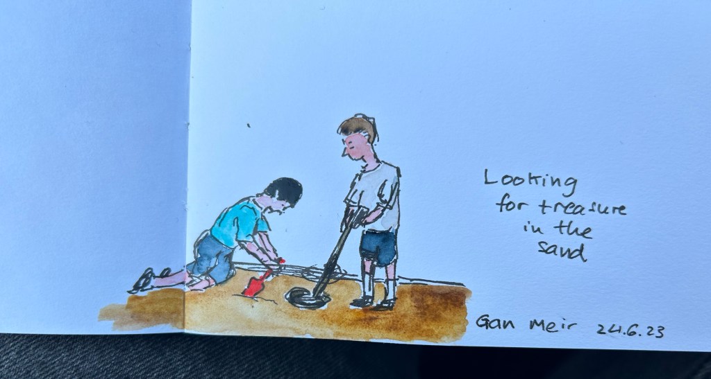 I then saw a group of kids with a metal detector, searching for treasure in the sand, so I sketched them quickly: