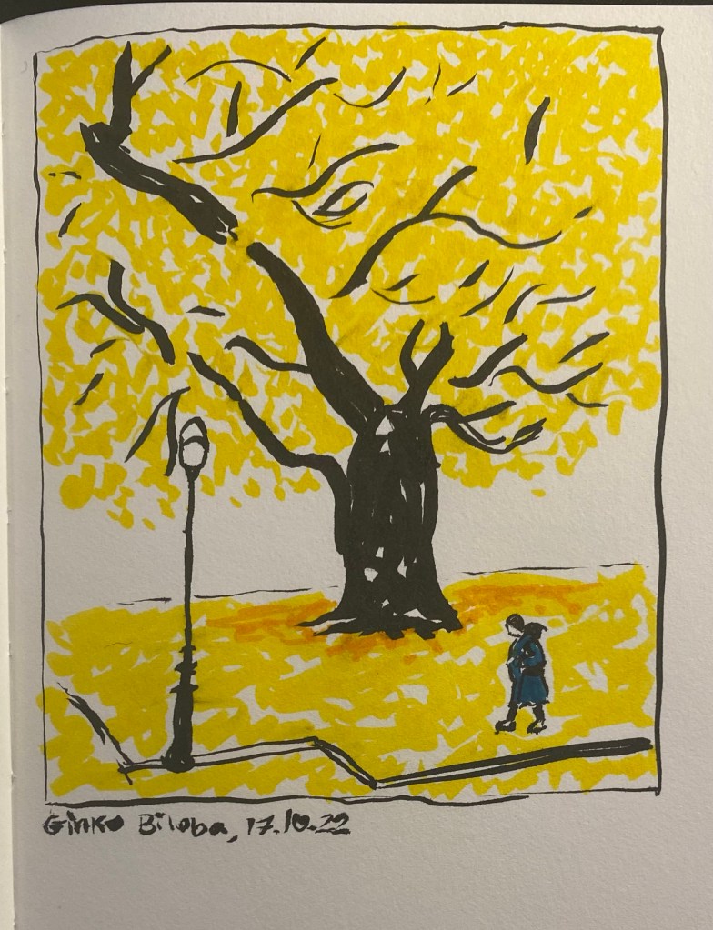 There’s no real autumn here, and I really miss the leaves changing colour and an actual autumnal season, so I decided to dedicate the next few inktober sketches to trees in autumn. The first is ginko biloba, with its gorgeous golden leaves. This was sketched with a Pentel GFKP brush pen, the king of brush pens, and Faber Castell Pitt brush pens on an A4 Midori MD Cotton notebook.