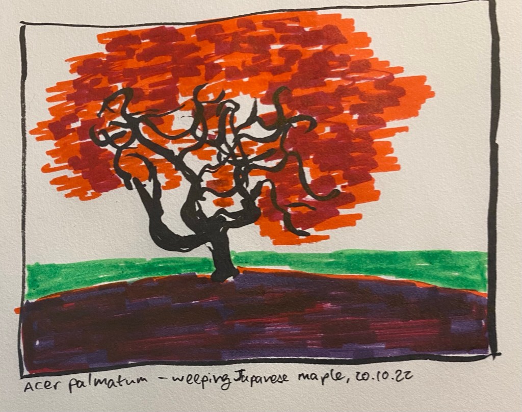 This is the last sketch that will focus on individual tree foliage, and this one is dedicated to the striking Japenese Weeping Maple and it’s vivid red leaves. Midori MD A4 Cotton notebook and various brush pens.