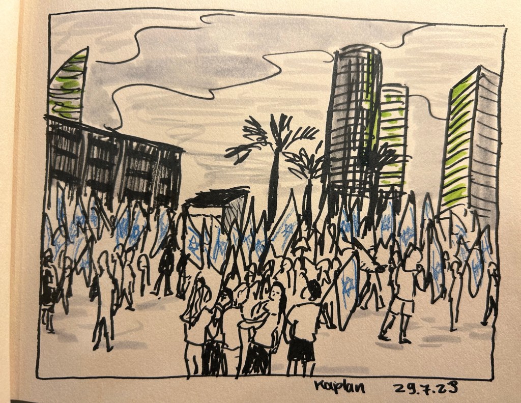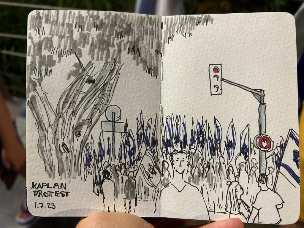 I used them all to draw the protest scene from this Saturday, using a photo I took during the protests. It was intensely hot and humid, and I went to the protests right after running a Dungeon World game at a small local tabletop roleplaying convention. With no art supplies on me, the best I could do was try and capture the scene to sketch later. When I was pulling things out to try out with this sketch, I decided to veer away from my comfort zone: I used tinted paper, a sign pen, mixed media, and an unusual colour. I like the result – for a quick sketch it captures the energy of the moment well.