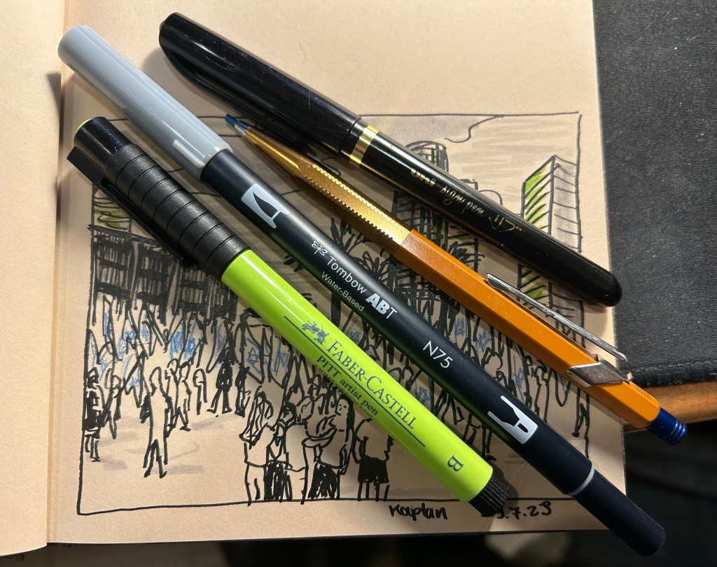 My main sketching tool was the Uni Sign Pen. This is the first time I’ve used a sign pen for “serious” sketching, as I normally only use them for illustrations that I gift to friends’ kids. I like it – it has relatively little line variation, but on the other hand offers more control, and a good bold line. If you are dipping your toes into brush pens for sketching for the first time, this might be a good place to start to get a feel for the kind of thick lines these kinds of pens create.
