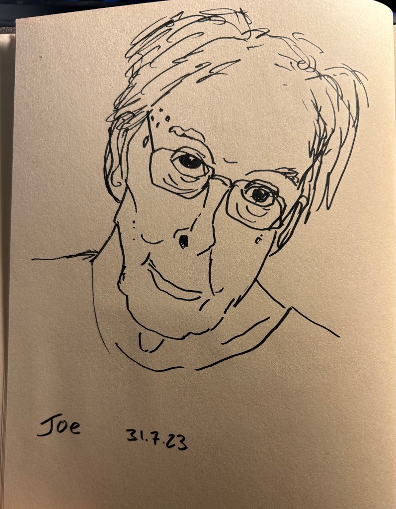 I also sketched our friend Joe during our weekly Zoom meeting, also on the Hahnemule Cappuccino and using the Uni Sign Pen. This was a very quick sketch, done it 2-3 minutes, and the sign pen does well with expressive lines.
