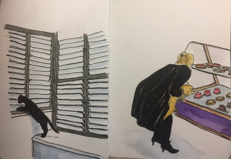 The outline and cat were drawn with a Waterman Phileas (EF nib) and Noodler’s Heart of Darkness (which I haven’t used in years, no idea why), and the hat and clothes were filled in with a Tombow Fudenosuke dual sided brush pen.