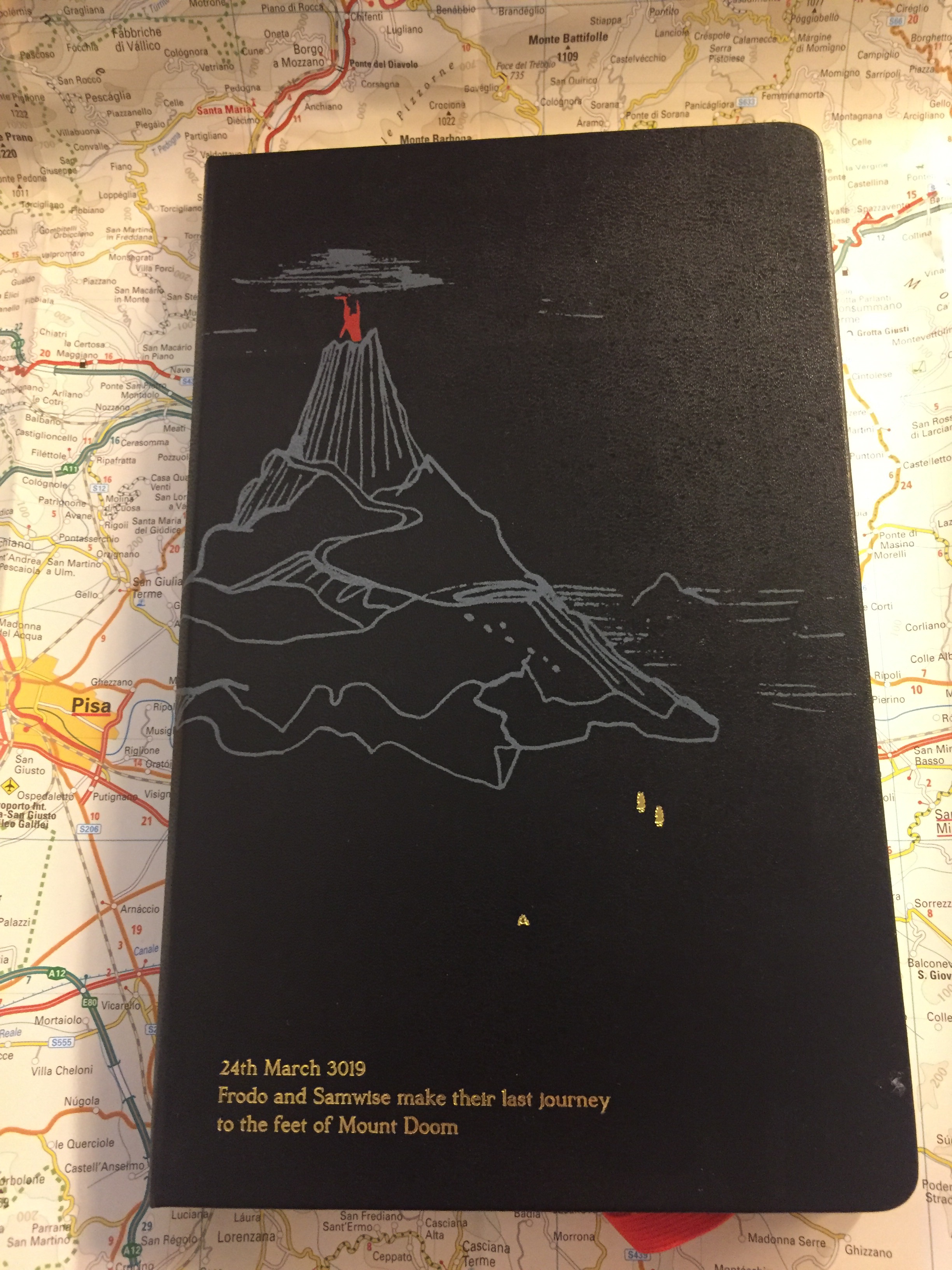 The choice of red elastic closure and a black cover is perfect for this notebook, and the gold embossing of the date, the scene and Frodo and Samwise really pops.