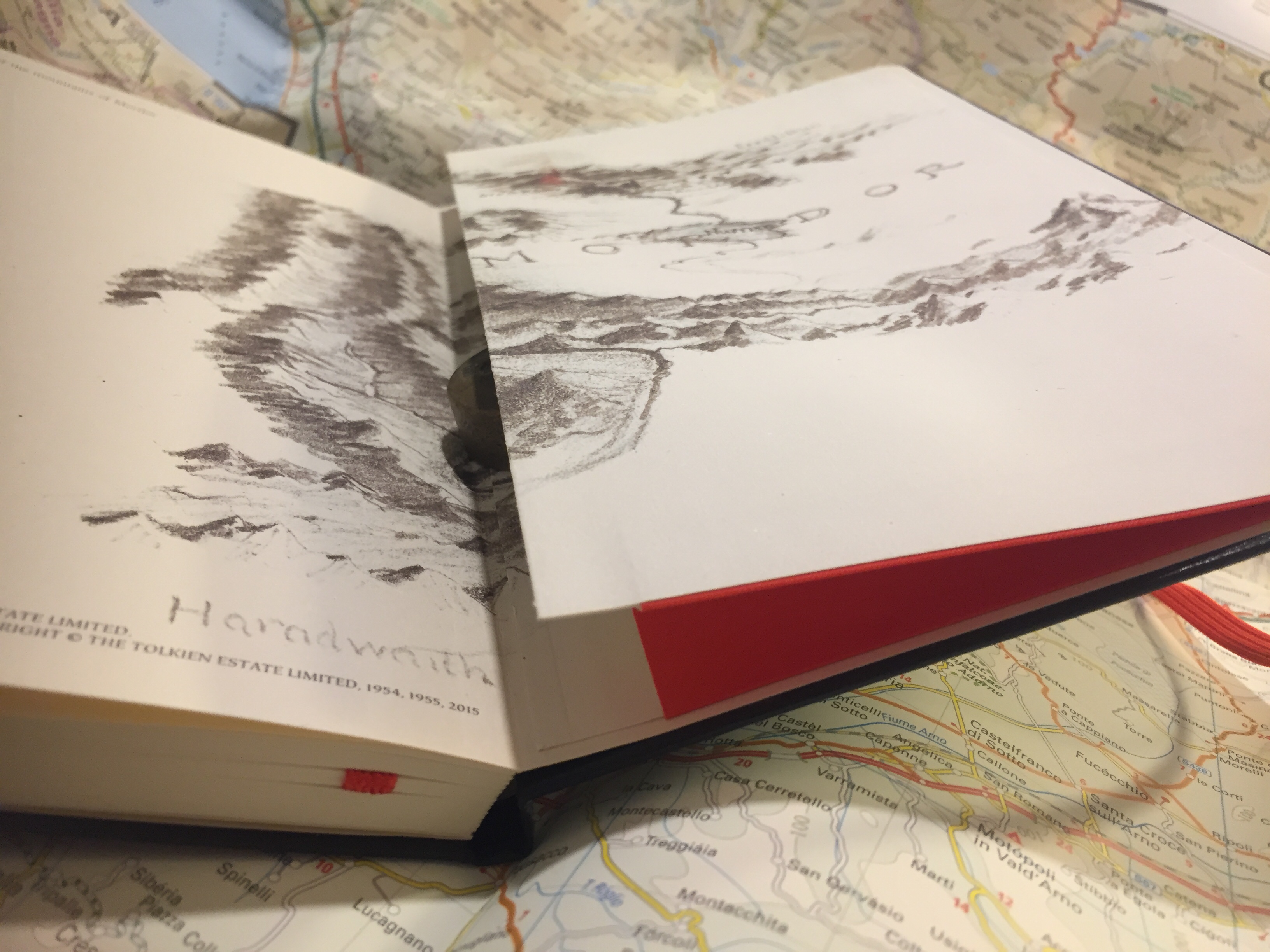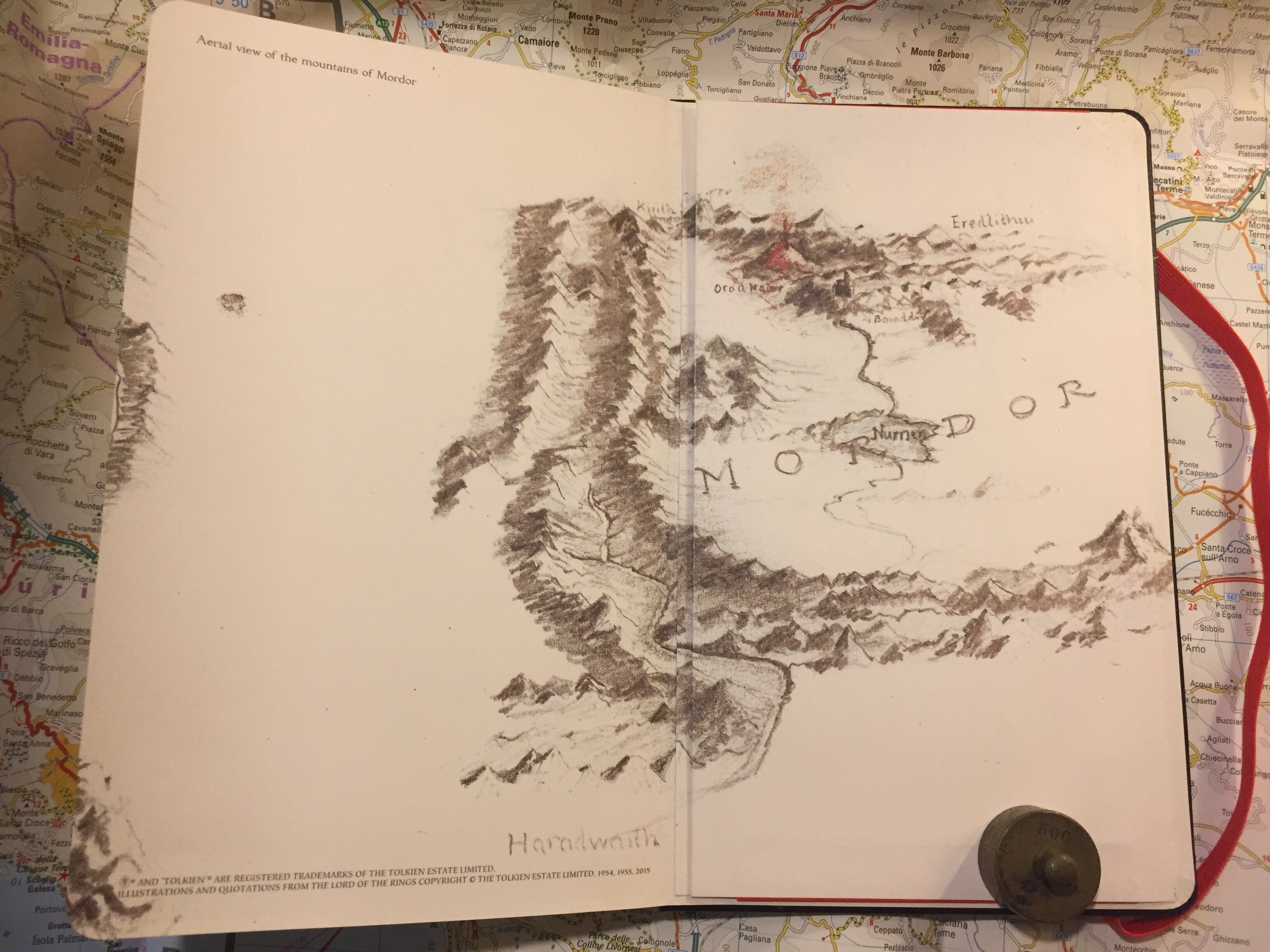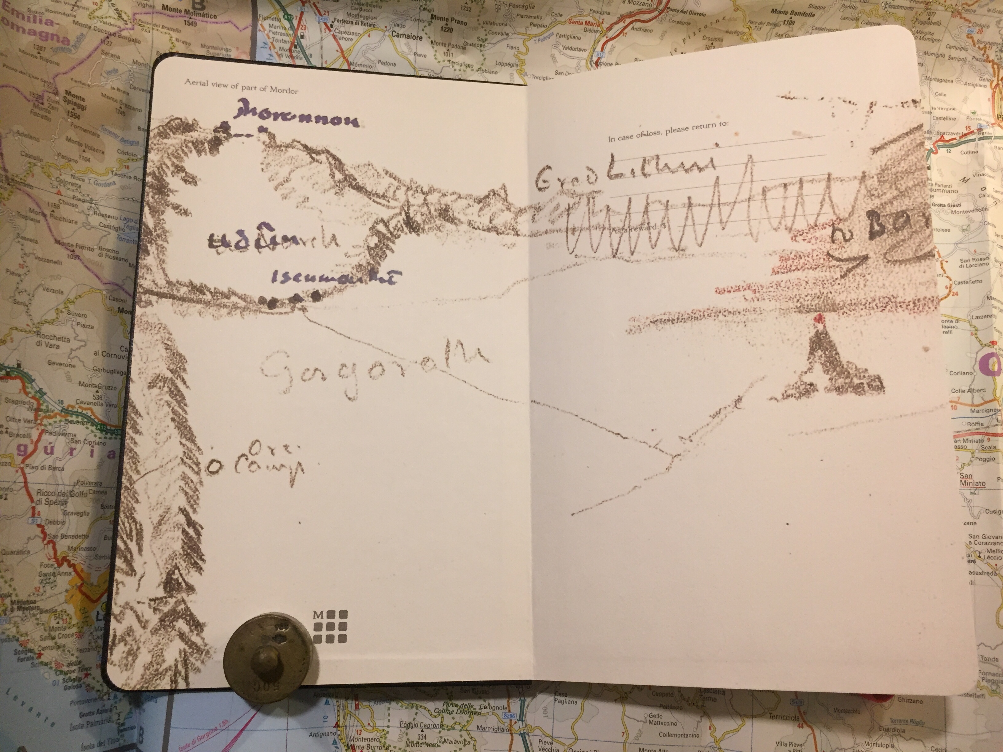 The front end page with Tolkien’s pencil drawings of an aerial view of Mordor. The drawing is very nice, but it does make the “In case of loss” pretty obscure. You can either go extra bold here, or try to blend in and hope that someone will notice.