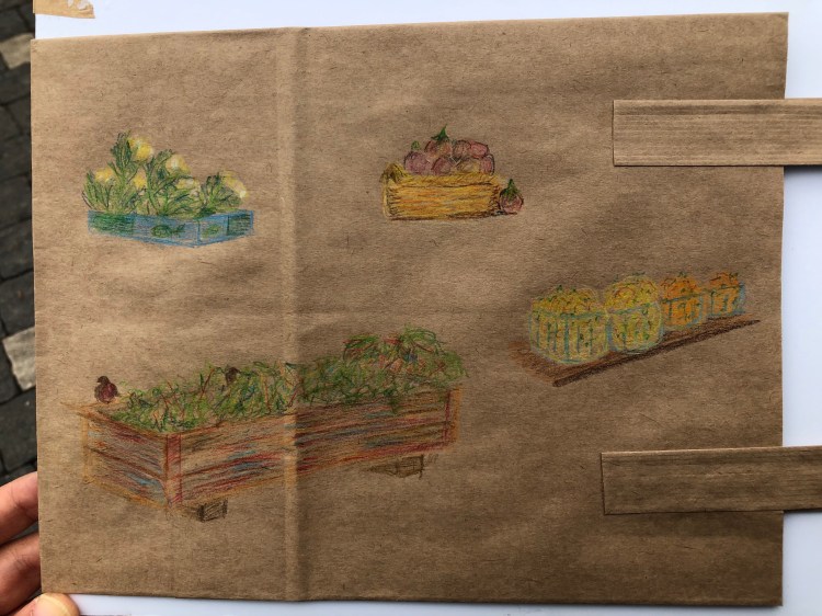 I drew this on a small paper bag with Koh-I-Noor Tri Tone coloured pencils set. Scenes from the Tel Aviv Port market, drawn during an Urban Sketchers sketch walk.