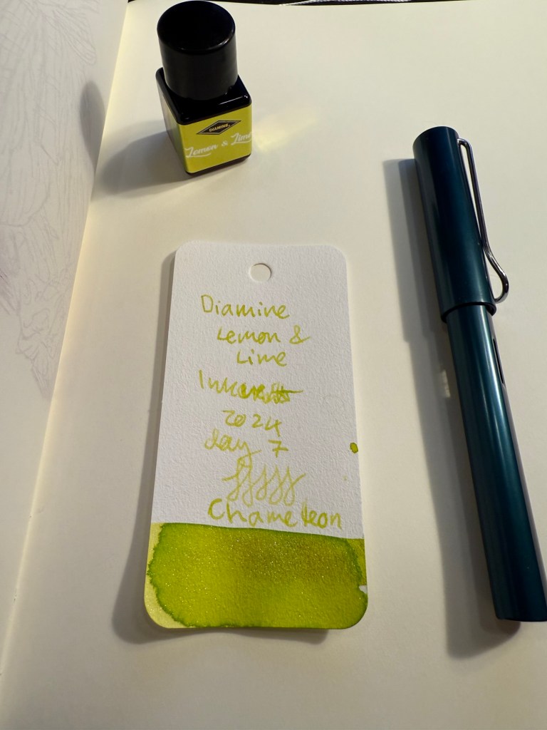 Day 7’s ink is Diamine Lemon and Lime – a light lime green ink with green to gold chameleon shimmer. I used a Lamy AL Star broad nibbed fountain pen to test this ink out.
