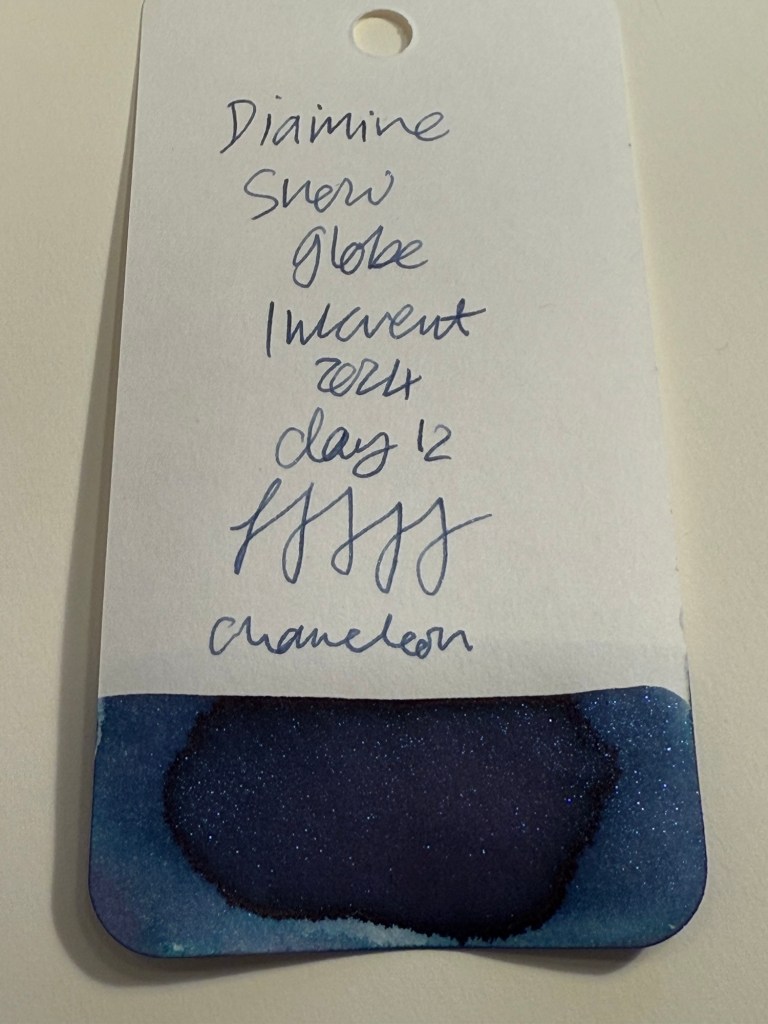 Day 12’s ink is Diamine Snow Globe, a dark blue ink with Chameleon shimmer in blue, silver, pink and purple. I used a Pelikan M205 fountain pen with an extra fine nib, that like most Pelikan nibs writes on the wider side.