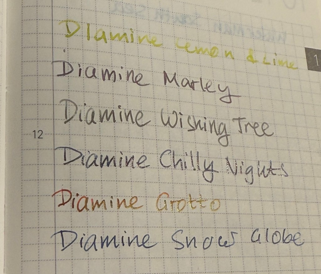 And from a different angle you can see the dazzle of the shimmer effect. Compare it to yesterday’s Diamine Wishing Tree directly above it – that one’s a Chameleon ink. You can barely see the shimmer effect on Wishing Tree and you absolutely can’t miss it on Diamine Chilly Nights.