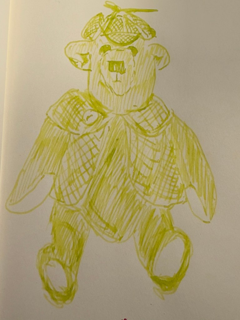 Today’s bear is one of the few that I have that have clothes. His name is, unsurprisingly, Sherlock, and I purchased him in York. He’s a Canterbury Bear, designed and made in England by Maude and John Blacktown.