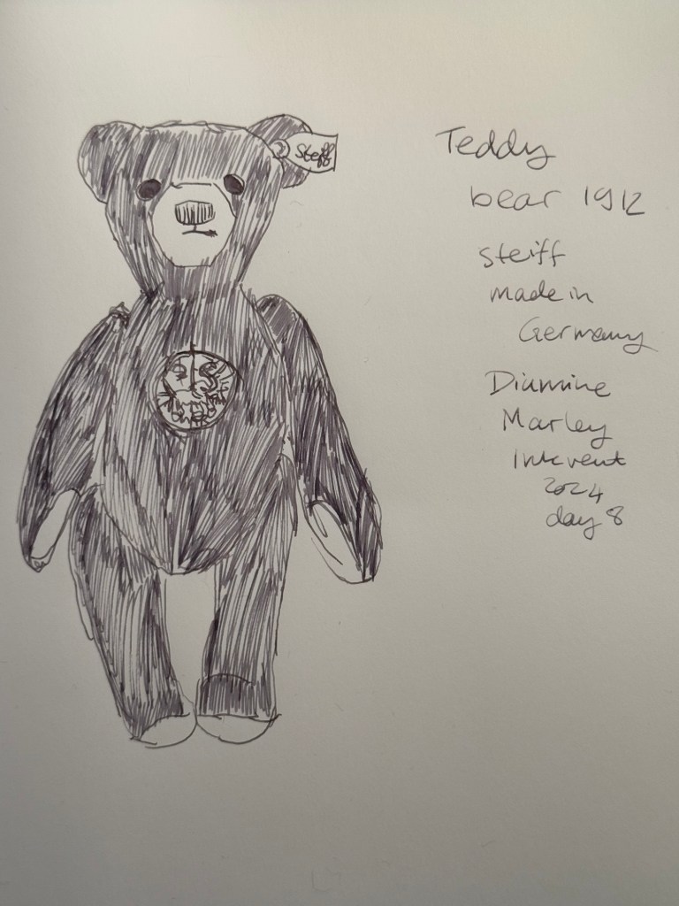 Today’s teddy bear is a German Hermann teddy bear, numbered but not named. I bought him in York, mostly for his unusual eyes.