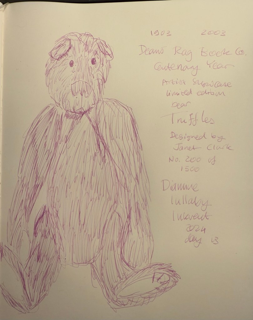 I flipped the nib around for the fine lines on today’s bear sketch. Teaberry is an unusually shaped bear but there are quite a few Charlie Bears that come in this style. I had to shade the lamp to get a decent photo due to the glint from all the glitter.