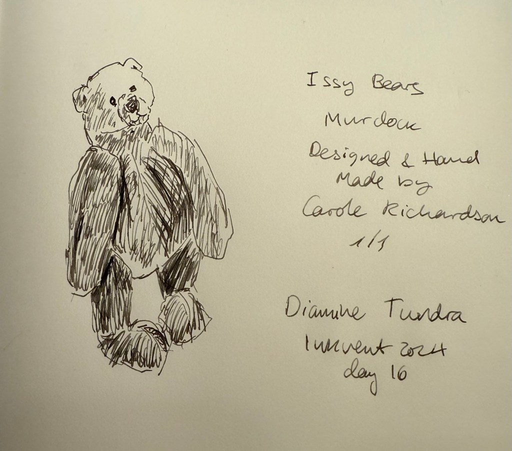 Today’s bear is Beezy, a one of a kind bear made by June Whitehead. The sketch is angled because this bear isn’t really designed for standing, and I didn’t want to sketch him seated because I’ve sketched too many seated bears lately.