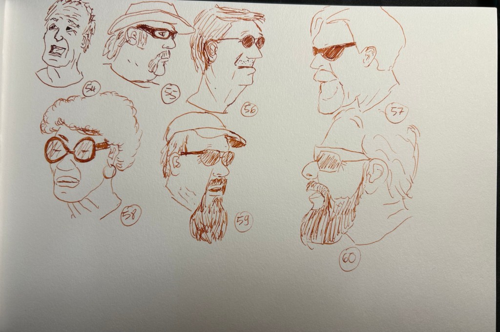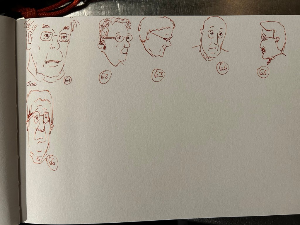 So 100 people completed – the fastest ever I’ve done this challenge, and all of them sketched from life. I plan to complete this page tomorrow and then go back to my Field Notes sketchbook to try another style of sketching people on the move.