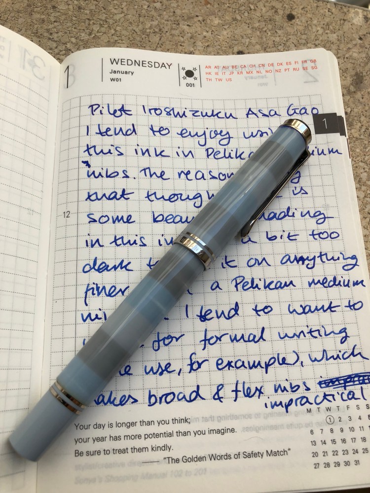 Though I’m a fan of the colour blue, I tend to shy away from blue inks, since they tend to be boring. That’s why I wouldn’t have splurged on a (pretty expensive) bottle of Pilot Iroshizuku Asa Gao myself – I got it as a gift with a pen purchase a few years ago.