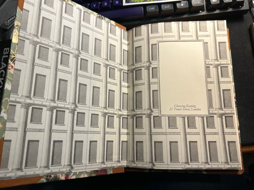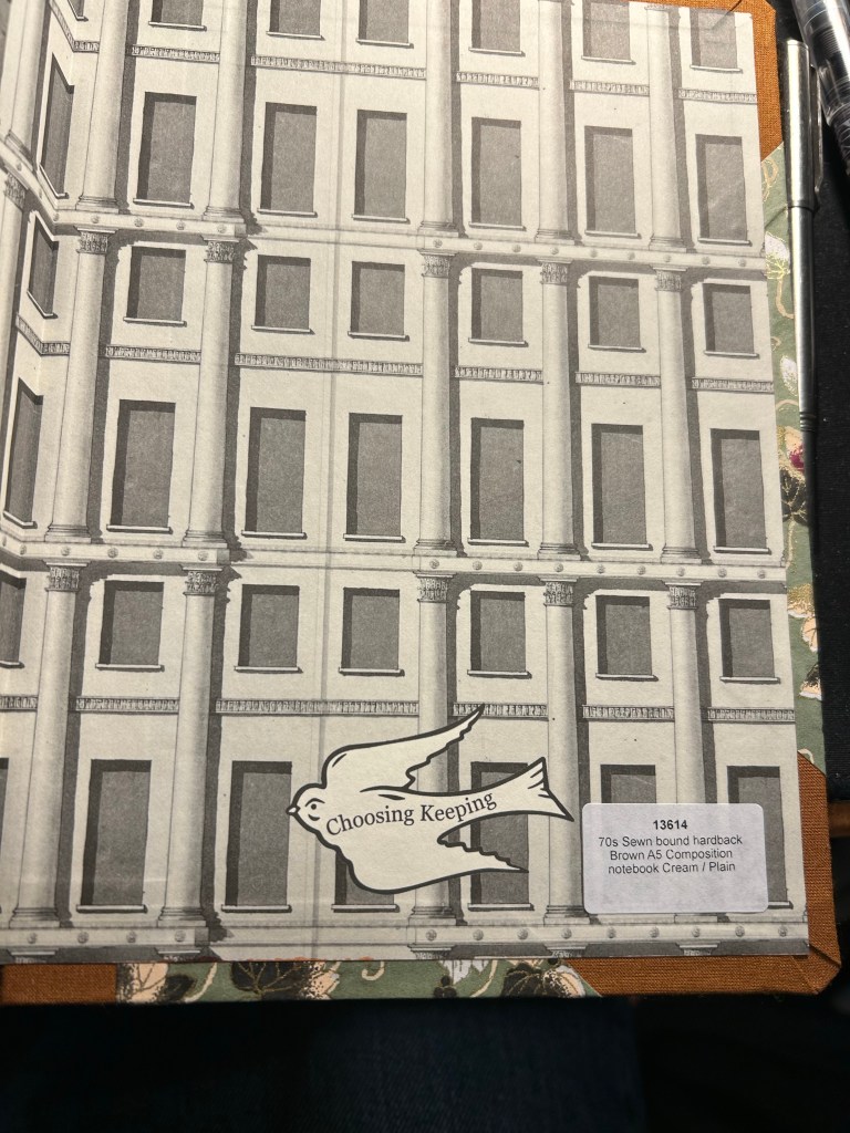 Front endpaperBack end paper with the Choosing Keeping bird sticker, and details on the notebook.