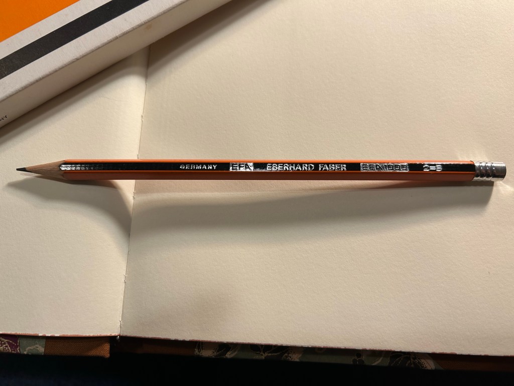 The pencil comes pre-sharpened, and has an orange and black body that looks a bit like the Staedtler Noris, but in orange instead of yellow. It has “Germany”, “EFA”, “Eberhard Faber”, “EFA 1000” and “2=B” embossed on it silver foil. The fonts used look very futuristic and modern, which makes me think that this is a ‘70’s pencil.
