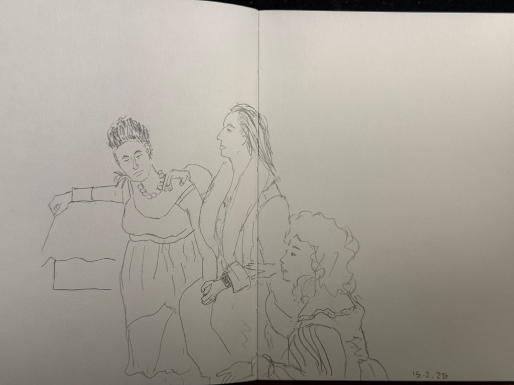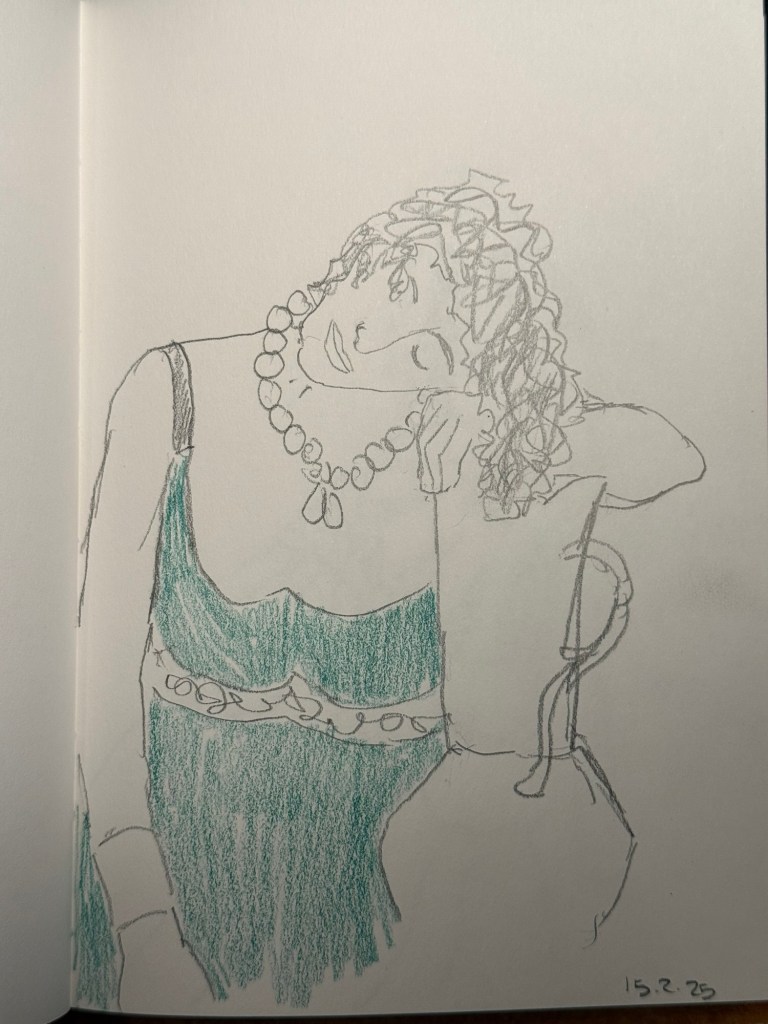 I went to the local art museum again this week, to sketch models in the museum. This was the last time this event was run, and the place was packed with sketchers. I didn’t have the best of locations, but I made the most of it. I sketched with Faber Castell 9000 2B and 3B pencils mostly, and added a touch of colour with Faber Castell Polychromos. The ink sketches were done with a Staedtler Pigment Liner 0.5. The sketchbook I used was once again the French Pascale Éditions. The models did fewer 20 minute poses and more 10 minute ones, which meant scrambling a lot. I wanted to visit the museum after the event, but I was so tired from 3 hours of non-stop sketching that I just went home.