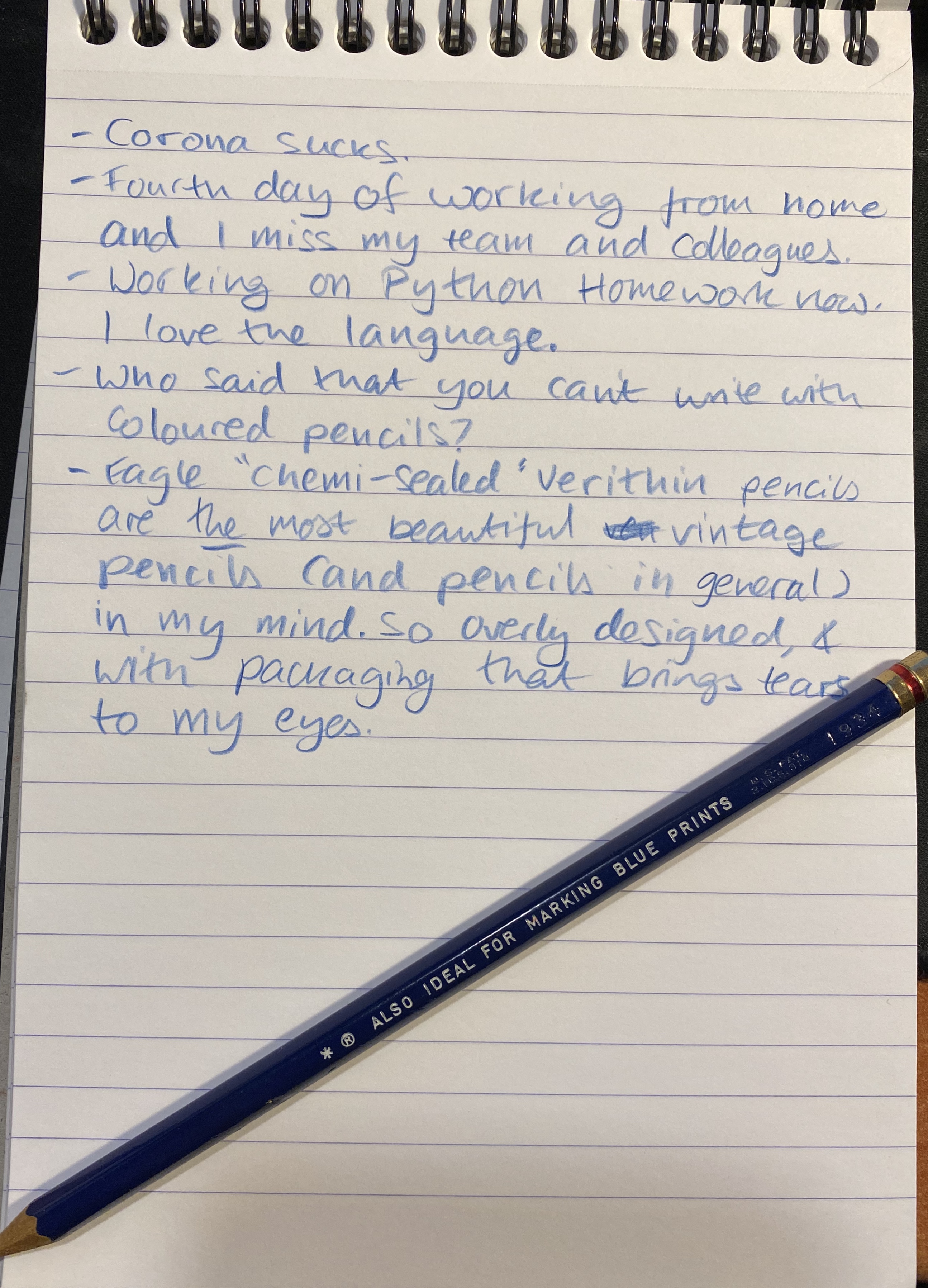 I was going to write a blog post reviewing the Viarco 3500, and so I started writing a page of notes in my usual pencil review notebook (the Baron Fig Confidant). Once I started writing I realized two things: